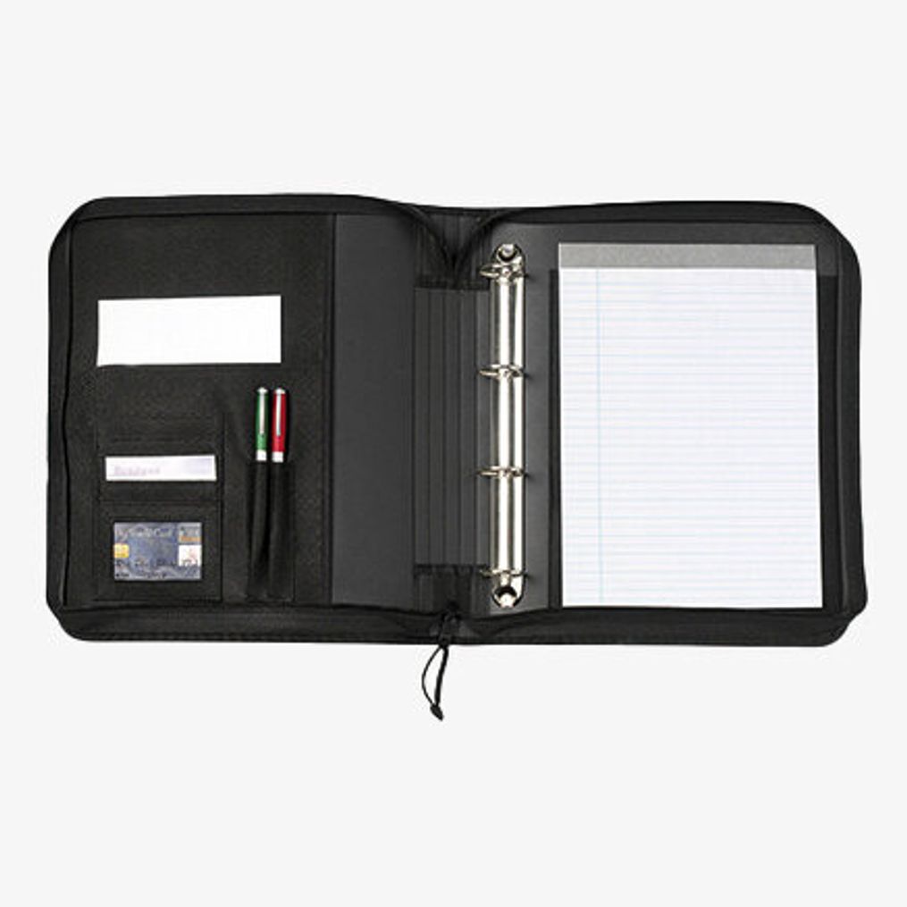 Konferencemappen Office Portfolio Singapur i polyester indeholder en notesblok på 30 sider, to penneholdere og en dokumentholder med ringe. Flere lommer giver ekstra opbevaringsplads.