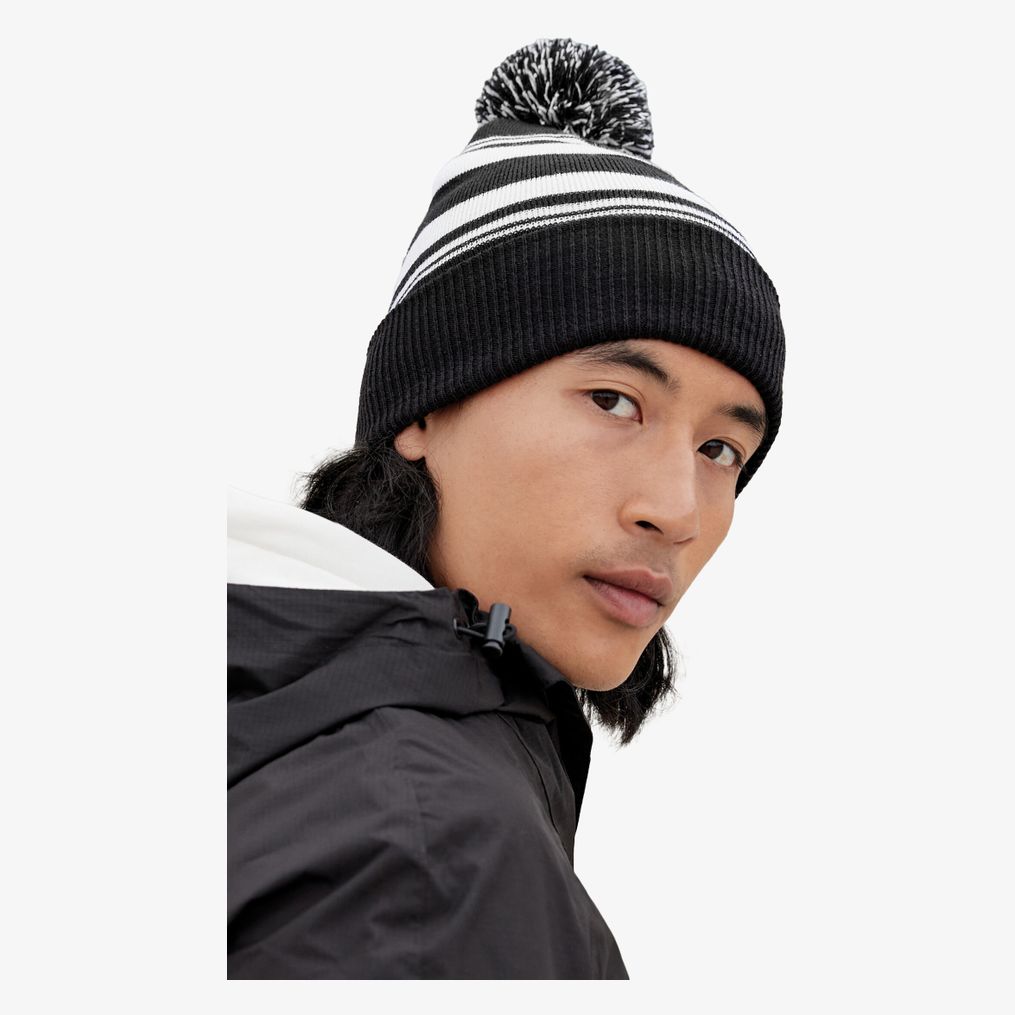 Den stripede supporterhue er en dobbel-lags strikket hue med opbrettet kant og tofarvet dusk. Den indeholder mindst 50% genanvendt polyester og et aftageligt mærke.