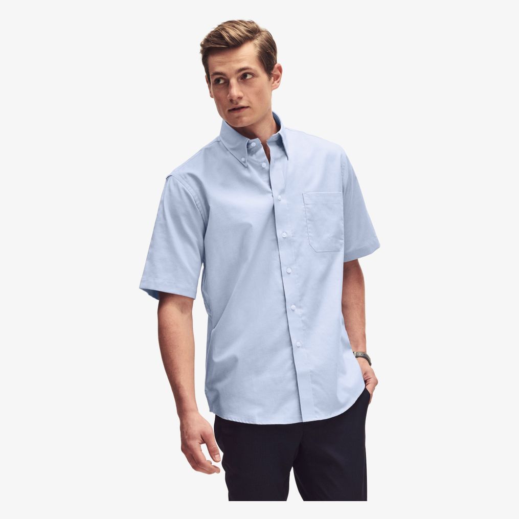 Men's Short Sleeve Oxford Shirt er en Oxford-skjorte med korte ærmer i 70 % bomuld og 30 % polyester. Button-down-krave, perlemorsknapper og venstre brystlomme til daglig brug.