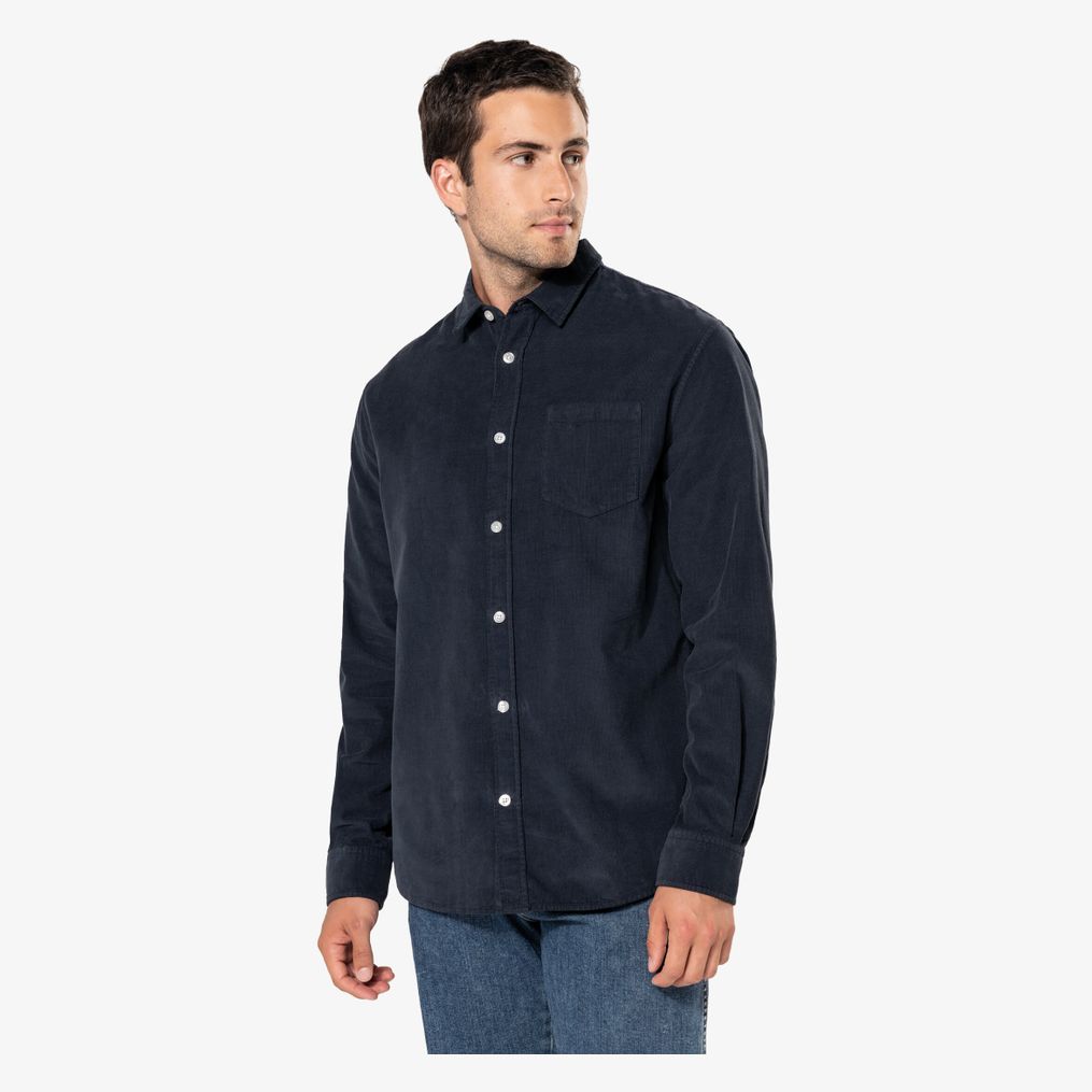 Den langærmet fløjls skjorte til mænd er lavet i bomuldsfløjl med smal pasform. Den har en brystlomme på hjertesiden med forstærkede hjørner, en påsyet knaplås med hvide knapper med perlemorseffekt og justerbare manchetter med to knapper med afrundede hjørner samt en tap. Det foret rygstykke er placeret øverst på ryggen, og bunden er rundet med en enkelt syning som afslutning. Farvningen udføres efter samling, hvilket kan forårsage små farvevariationer mellem stykker.