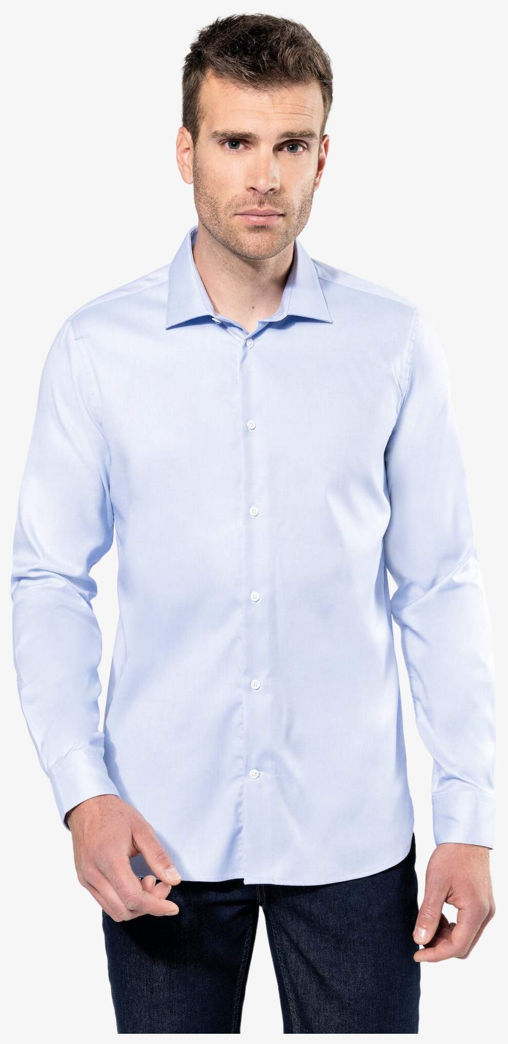Herre langærmet skjorte er lavet i Oxford pinpoint stof 100% bomuld med Easy care behandling. Den italienske krave indeholder aftagelige krogstivere. Den tætsiddende pasform forstærkes af to sømme bagpå og et øvre rygstykke. Manchetterne har to knapper med afrundede kanter, og der er lommer på siderne for bedre pasform.