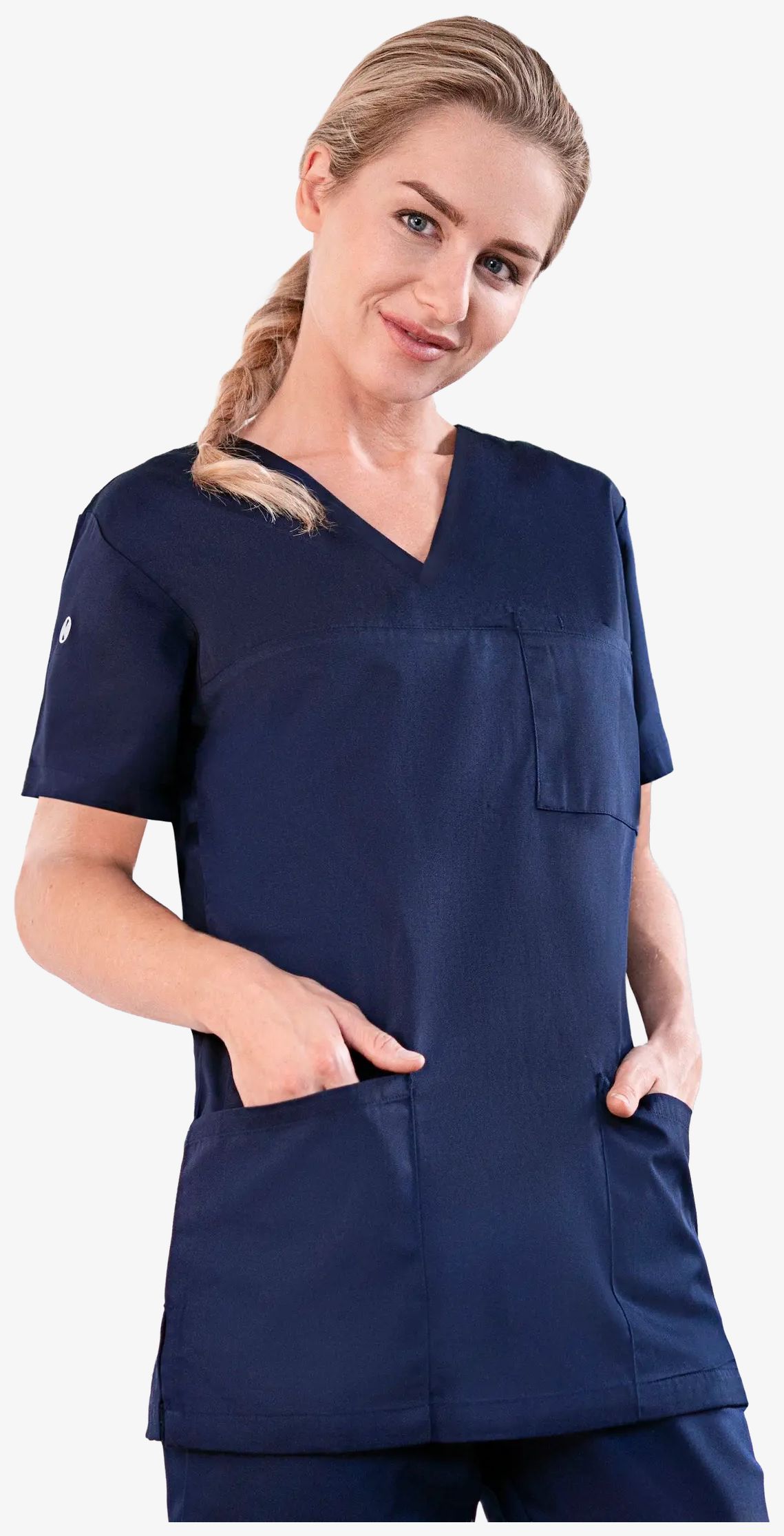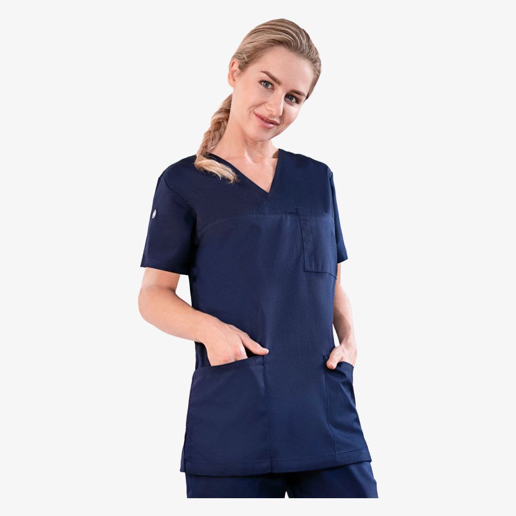 Kortærmet tunika til kvinder har V-hals og en let tilpasset pasform, der passer til sundheds- og skønhedssektorerne. Den kombinerer certificeret genanvendt polyester og bomuld til daglig brug.