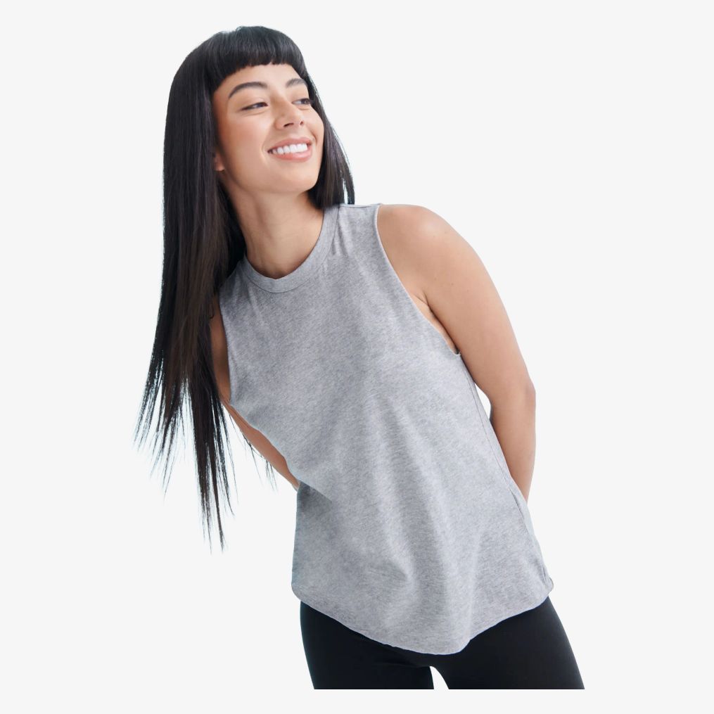 Dame tanktop har elastisk rund halsudskæring og udskårne ærmegab med rå kanter. Mærket kan tages af. Sammensætningen er 60% bomuld, 40% polyester, undtagen farven heather grey med 85% bomuld og 15% viskose.
