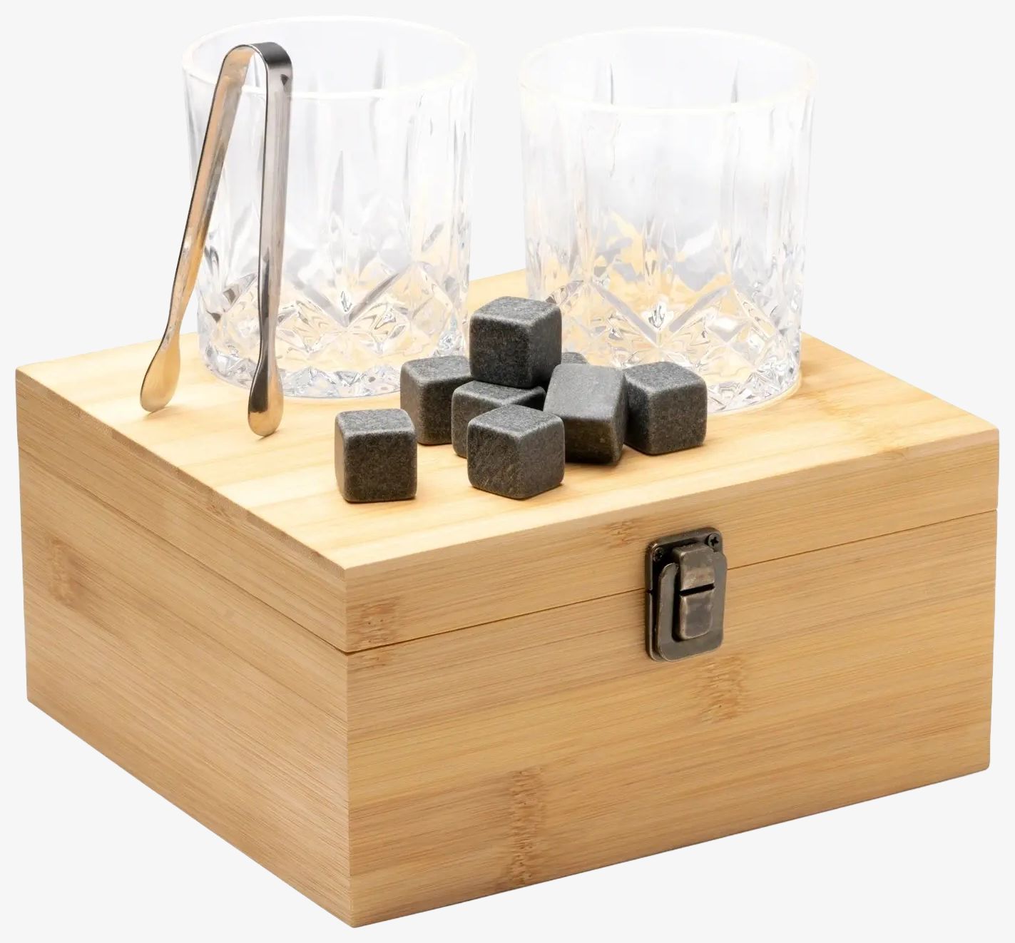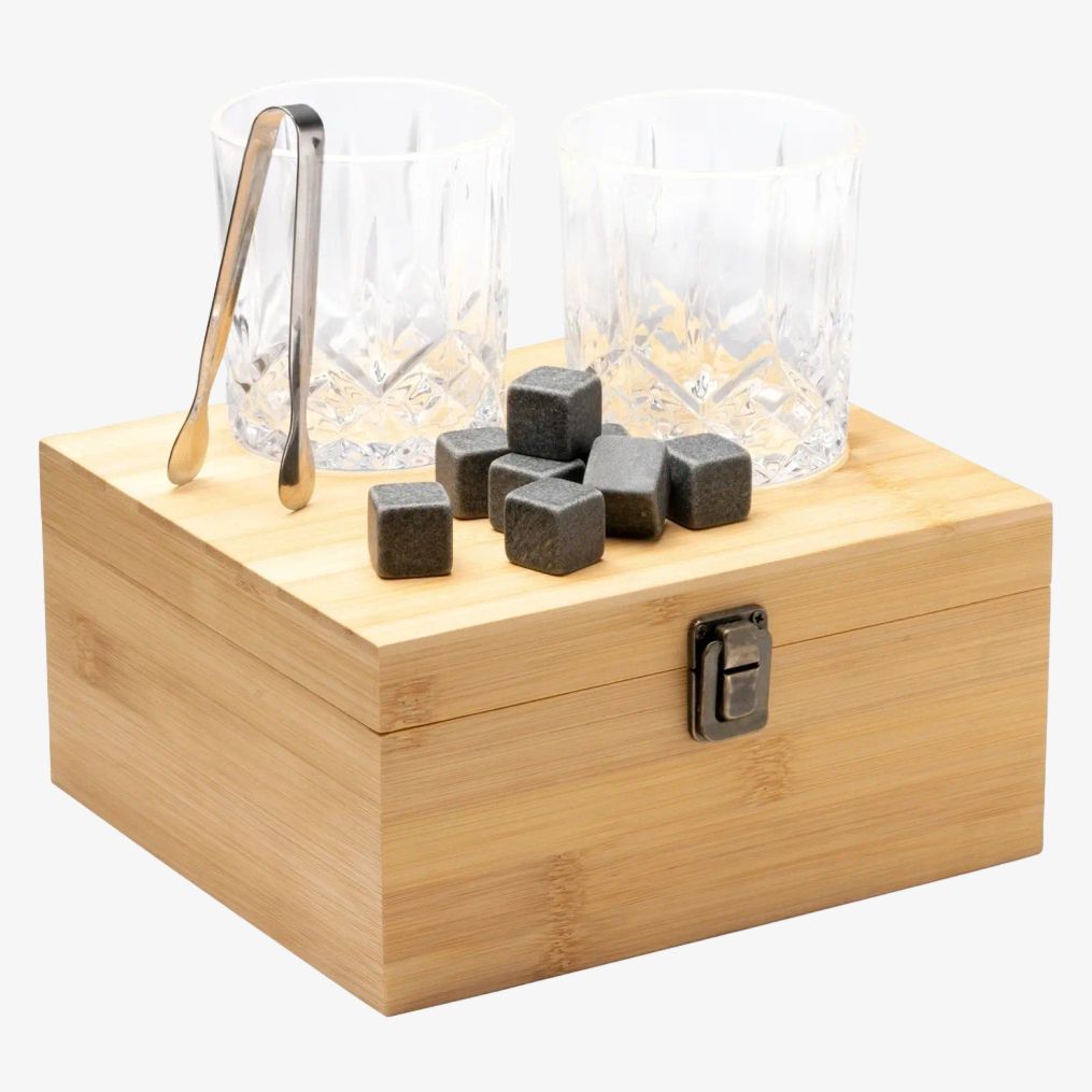 Danys whisky-sæt ck1598 samler de nyttige elementer til servering og nydelse af en drik uden fortynding fra smeltning af klassiske isterninger. Sættet indeholder to glas på 320 ml, otte genanvendelige isterninger i natursten, en tang i rustfrit stål og en holder i bambus.