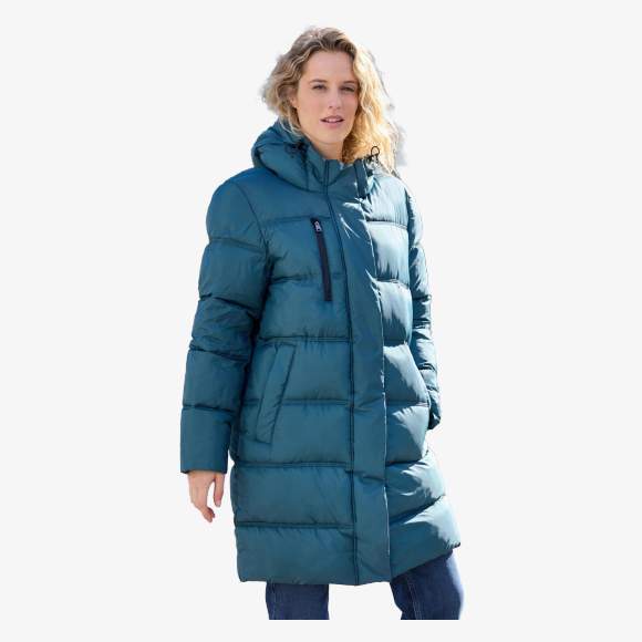 Den quiltede vinterfrakke i genanvendt polyester har polstring opdelt i store rum. Den har en brystlomme med lynlås, to sidelommer med lynlås samt en tovejslukning i fuld længde. Hætten er justerbar, og de indvendige manchetter er elastiske.