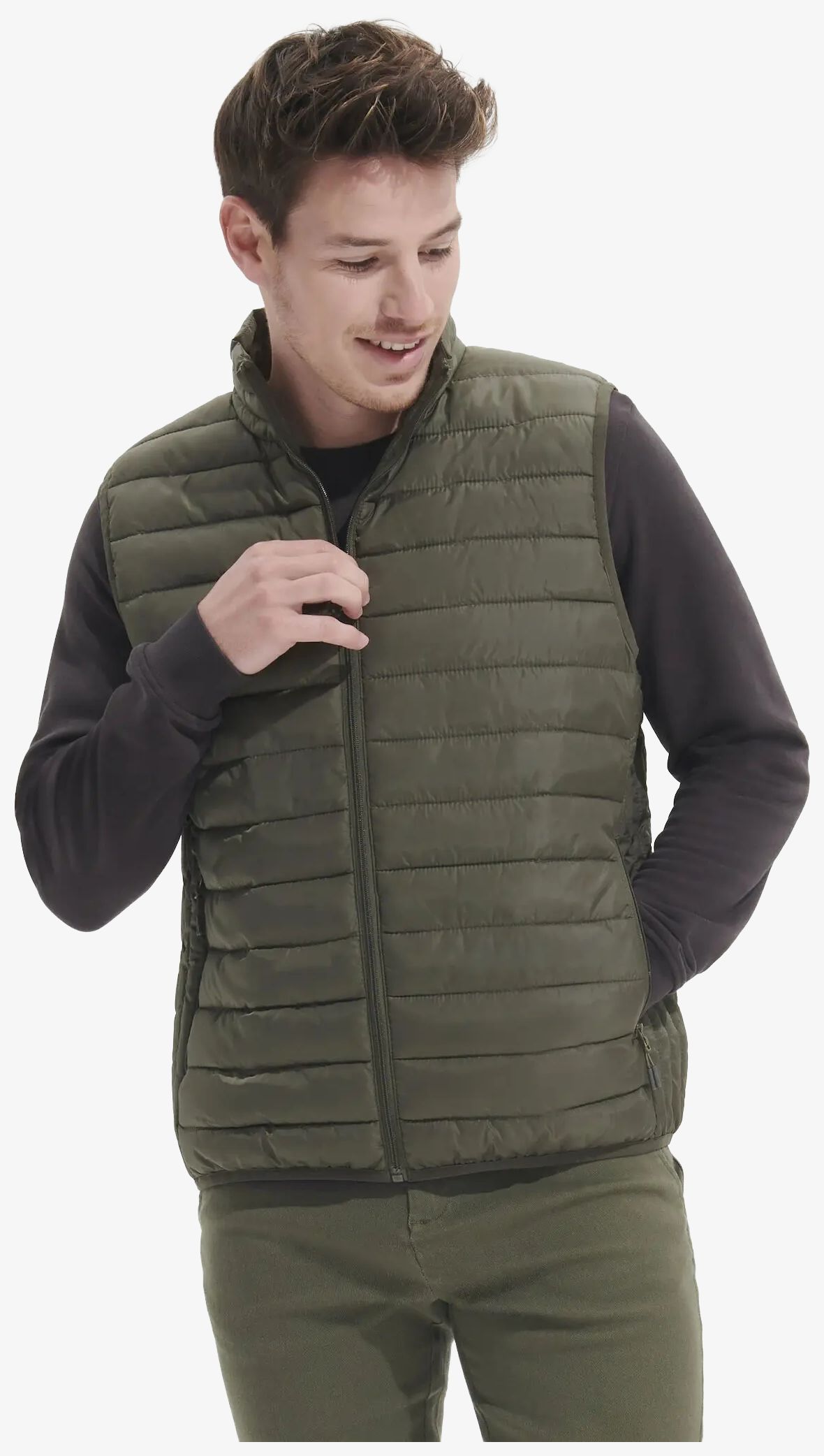 Den lette vest uden ærmer til mænd har en hovedåbning og sidelommer med nylonlynlås ton-i-ton. Den har en høj krave og en kant forneden med elastisk kantbånd ton-i-ton. En opbevaringspose medfølger.