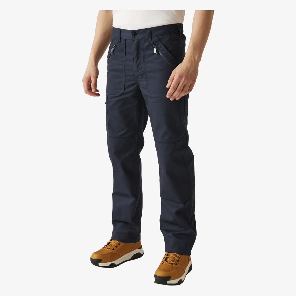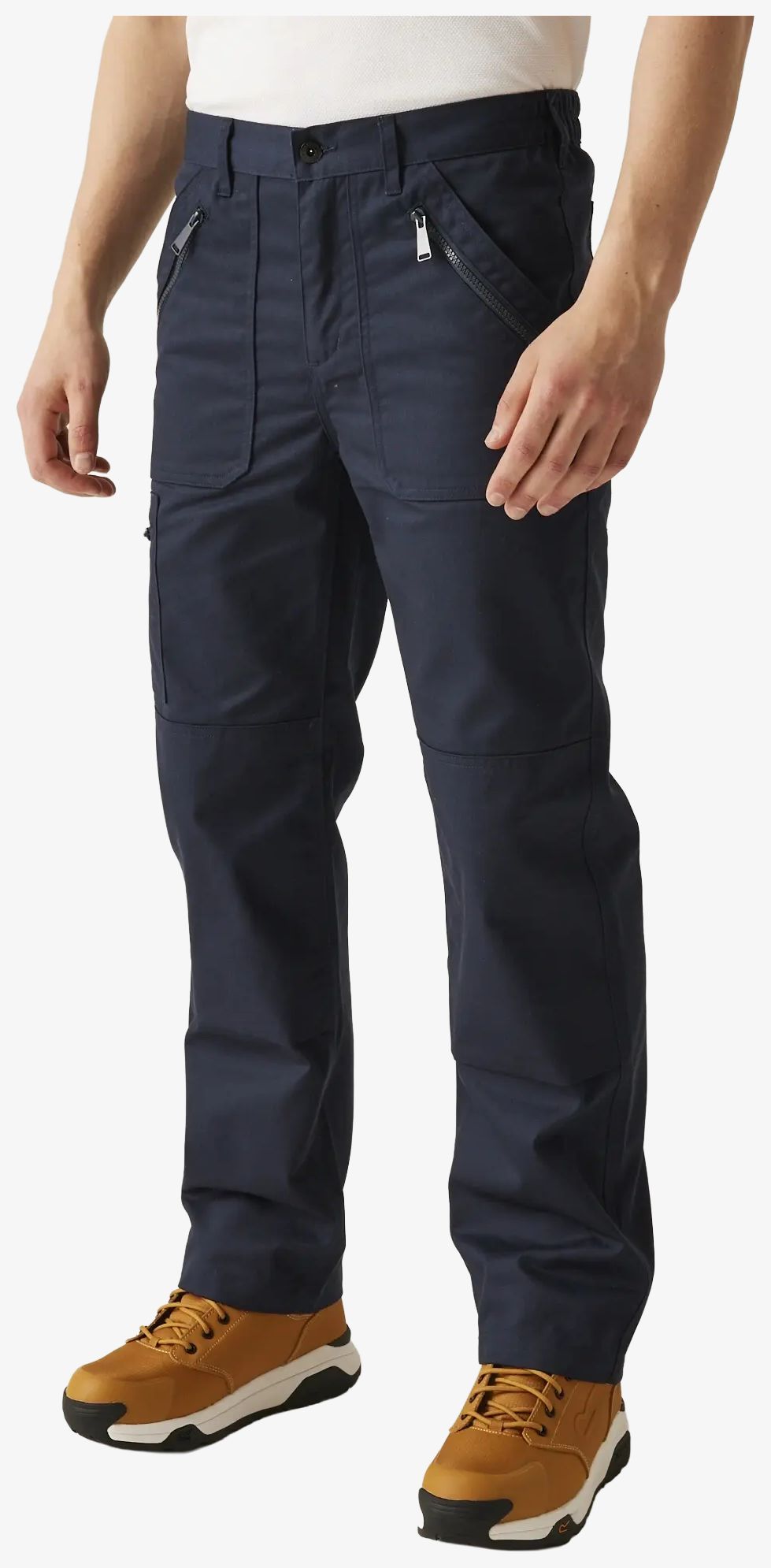 Pro Action Trousers er arbejdsbukser med delvist elastisk talje, bæltestropper, lukning med knap og gylp samt flere lommer til almindelig opbevaring. Knælommerne og de forstærkede sømme i skridtet giver en struktur, der er egnet til regelmæssig brug.