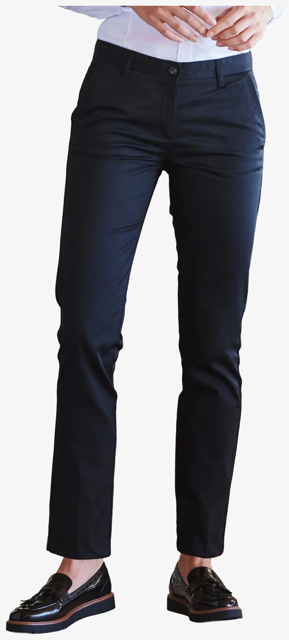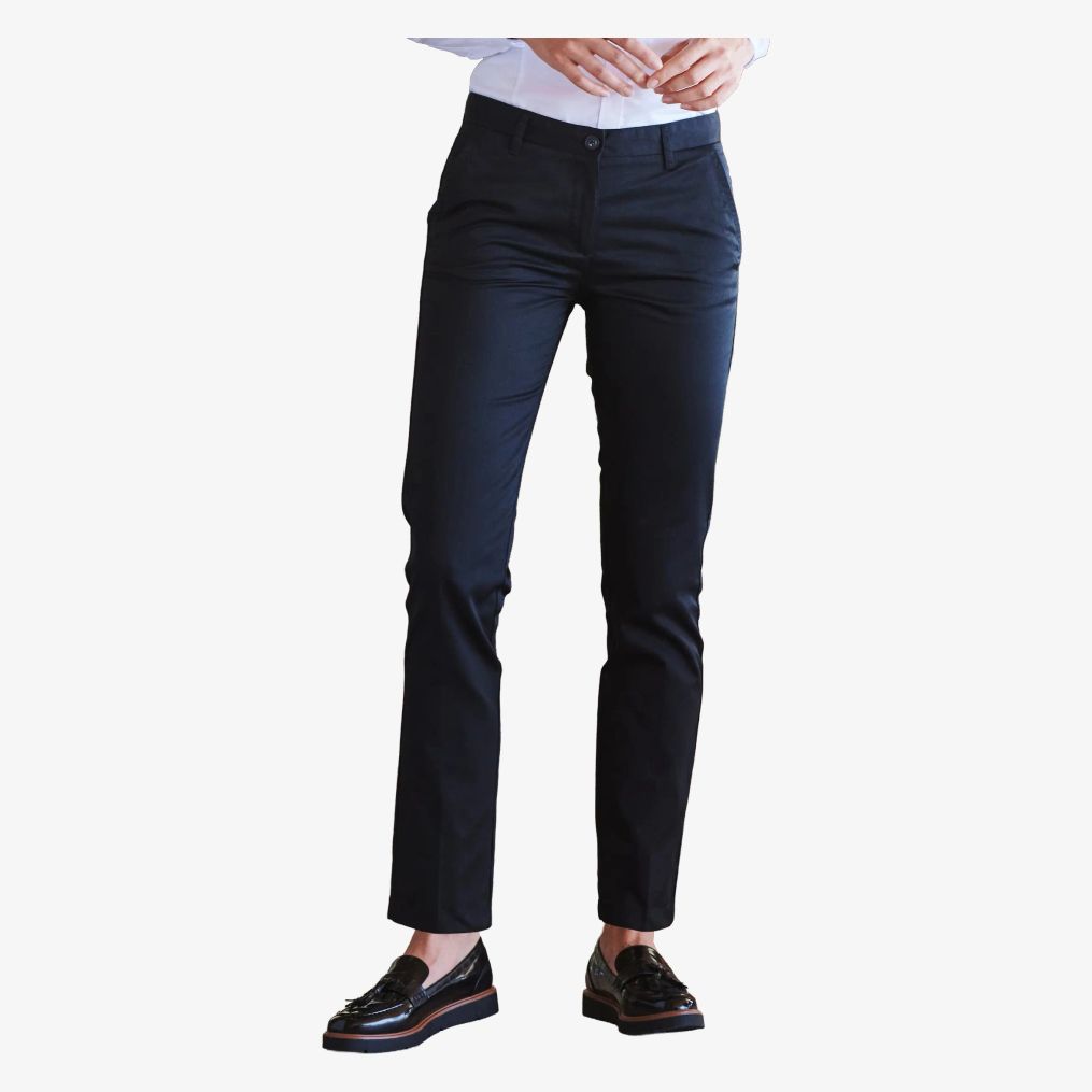 Dame chino bukser i polycotton har en lige pasform uden læg foran. Den har to baglommer med knapper.