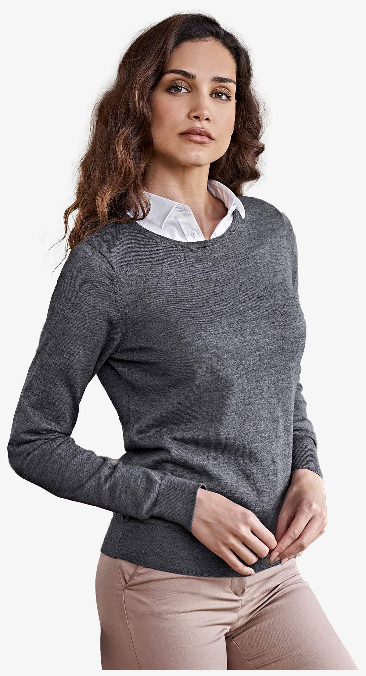 Dame rundhalset trøje med tætsiddende pasform og ribkanter på ærmer og i taljen. Strikket i 14 gauge for en ensartet struktur.