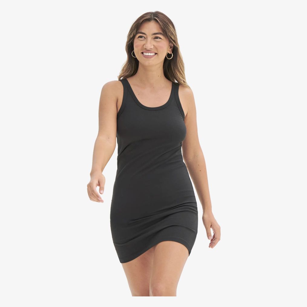 Den ærmeløse kjole har bred halsudskæring og ekstra lang længde, der gør det muligt at bære den som en lang tanktop eller kort kjole. Kantbåndet er placeret ved hals og ærmegab.
