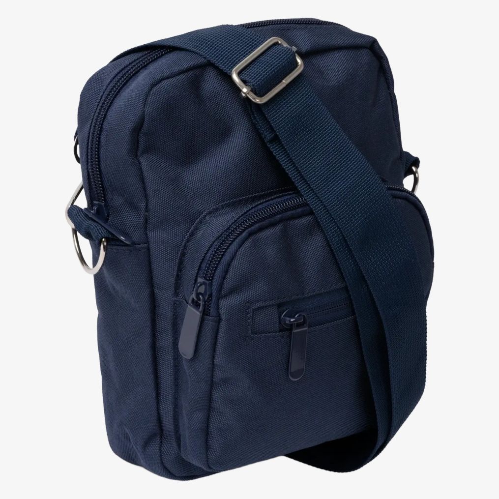 Skuldertasken MENEZ er lavet af RPET med dobbelt lynlåslomme foran og to sidelommer. Skulderremmene er polstrede for komfortabel bæring.