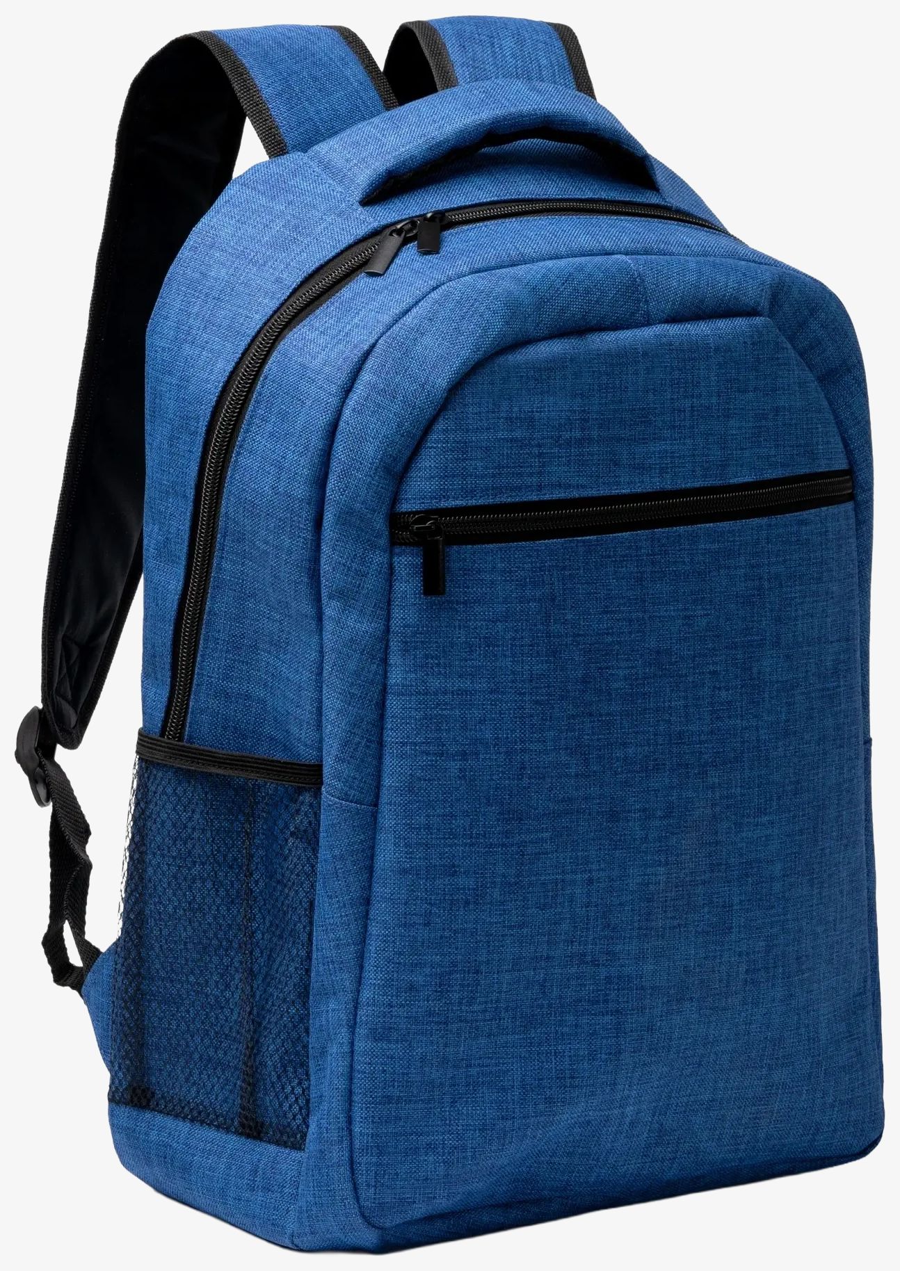 RPET 600 D rygsæk med marmoreret finish inkluderer polstrede skulderstropper og et stort indvendigt rum med lomme til 15 tommer bærbar computer. Den har også en ydre forlomme og sidelommer. Kapacitet er 20 liter.