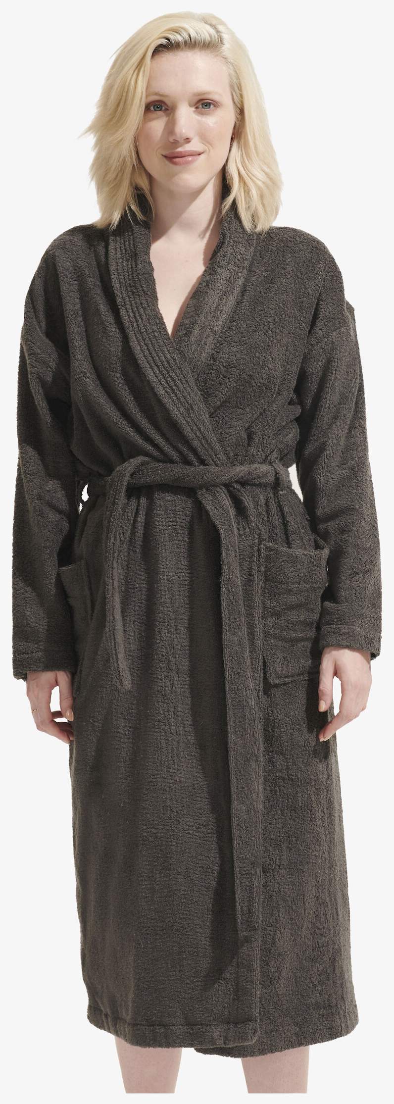Palace er en unisexbadekåbe i bomuld med sjalskrave, 2 påsyede lommer og bælte med dobbelte bæltestropper. Sjalskrave med strop i 2 positioner.