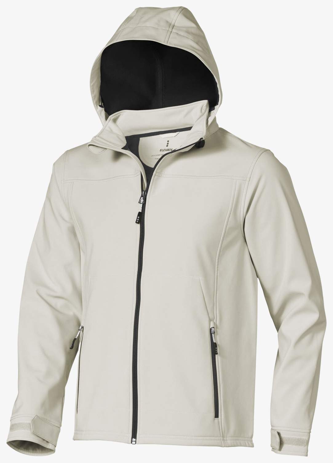 Herre softshell jakken inkluderer en aftagelig hætte med elastisk snor og en omvendt lynlås foran til lommerne. Stoffet er elastisk og vandafvisende.