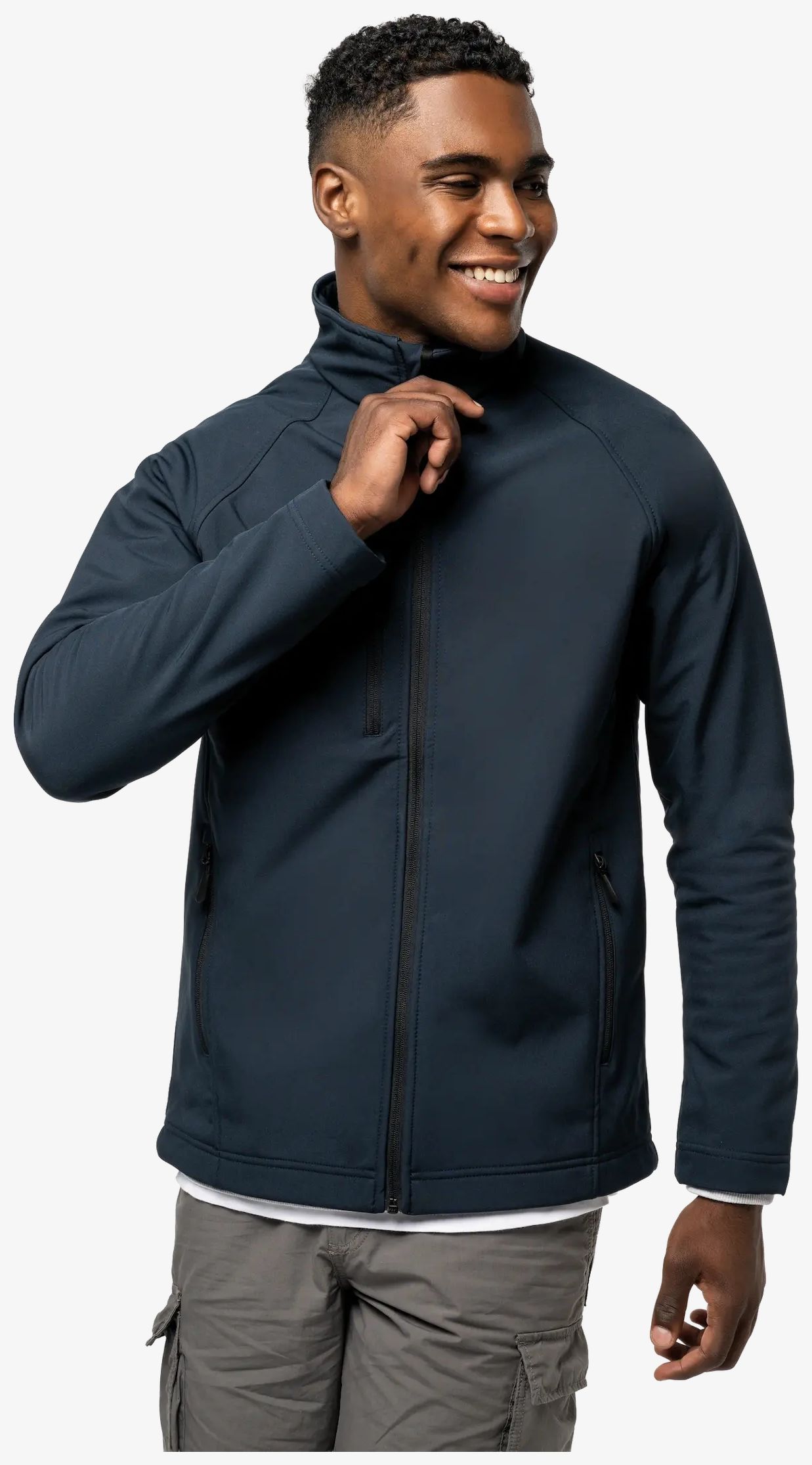 Den miljøvenlige softshelljakke med 3 lag kombinerer et vandtæt og åndbart polyesterstof med en tætsiddende pasform og flere lynlåslommer til sikker opbevaring. Den har en indvendig ophængningsstrop ved kraven og lommer med lynlås, der fungerer som inderlommer. Lynlåsen har en trækfunktion, og jakken er forstærket i bunden med dobbeltsyninger.