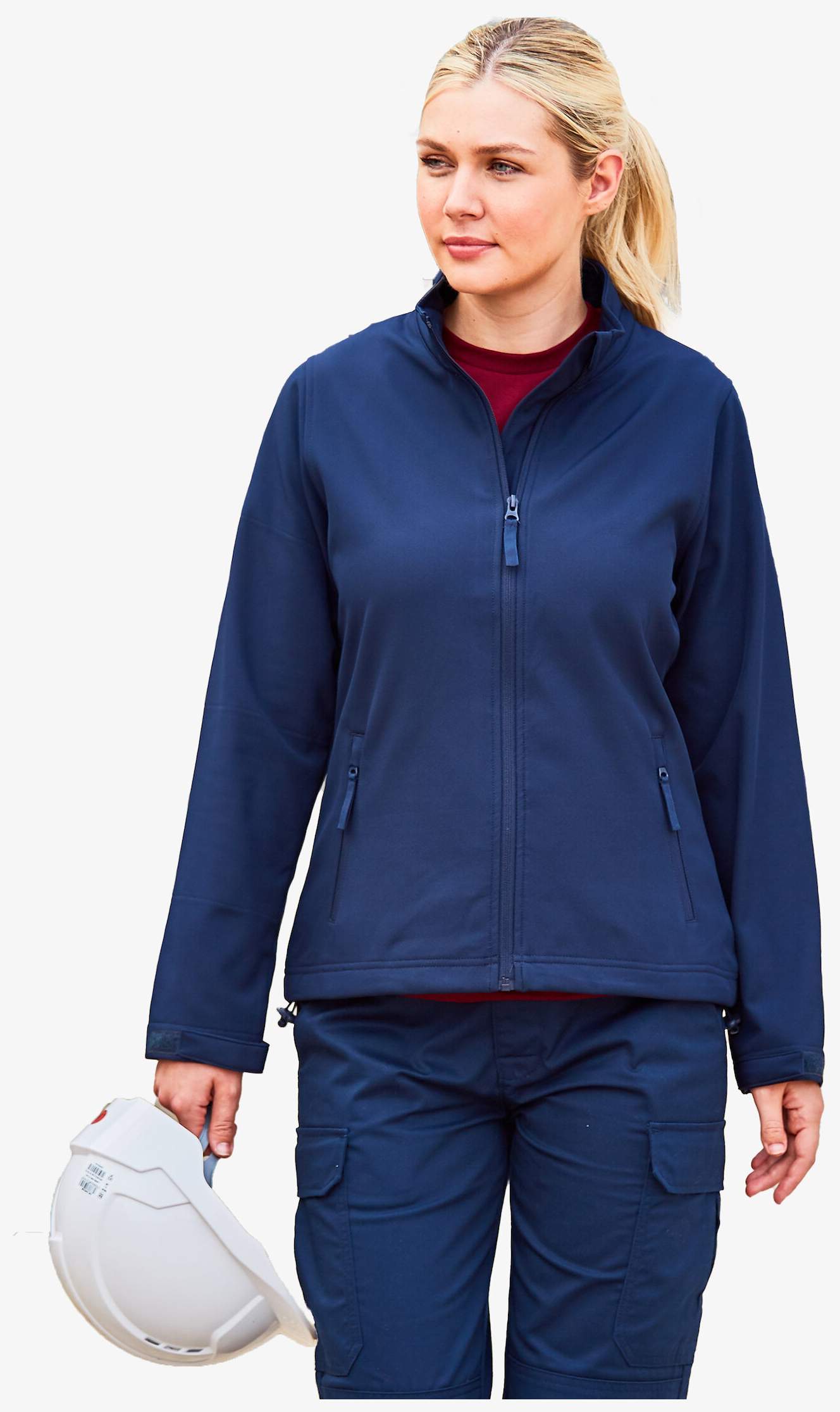 Softshell til kvinder har fuld lynlås foran og to sidelommer med lynlås. Den har hakelås med indvendig klap og elastisk justerbar snørre i kanten. Modellen giver beskyttelse mod vind og regn med en moderne pasform til kvindelig kropstype.