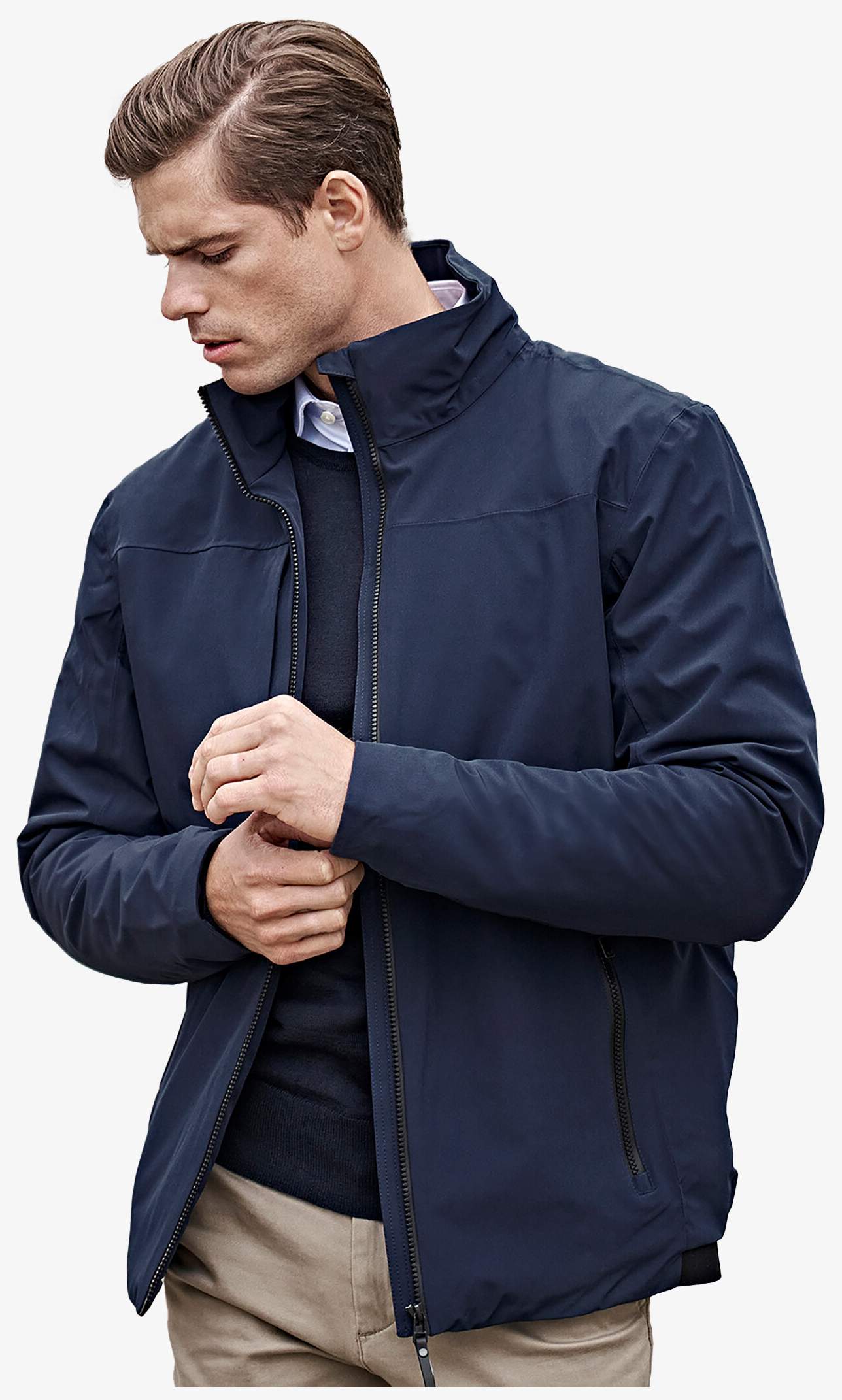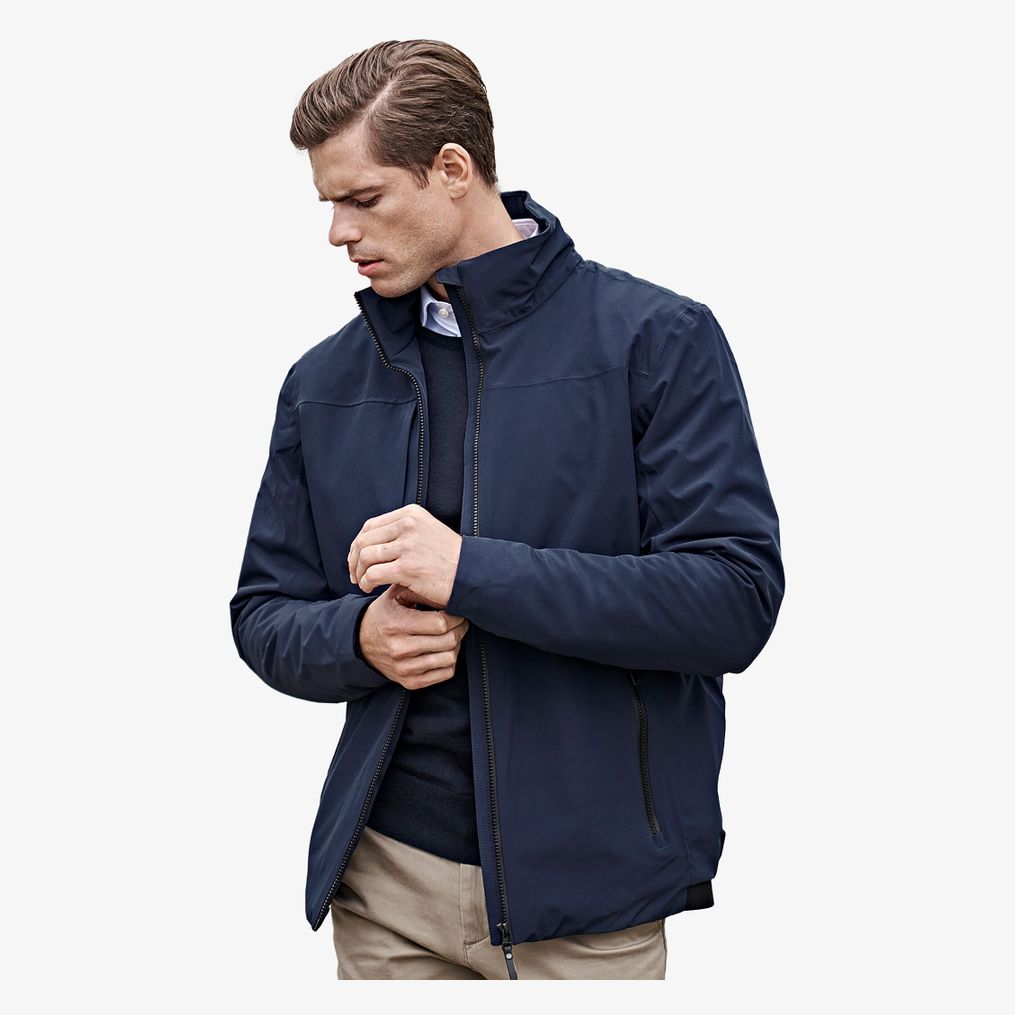 Herreårsjakke med vandafvisende materiale og høj krave. Indeholder to rummelige forlommer samt en inderlomme. Dens mellemlange længde bidrager til en moderne sportsstil.