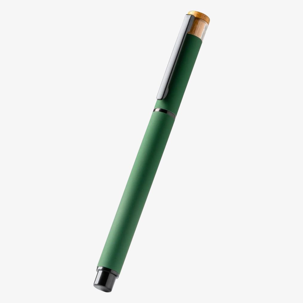 Kuglepennen har en krop af genanvendt aluminium og en metalclips med bambusdetalje. Jumbo blækpatronen er blå.