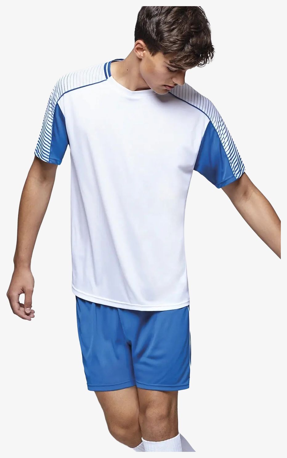 Unisex sportsæt består af 2 kortærmede semi-raglan tee-shirts med mønster og rund hals med strikket detalje bagpå samt 1 shorts med elastisk taljebånd, indvendig snøre og nederst med sidelommer. Farven på den anden tee-shirt er inverteret i forhold til den første.