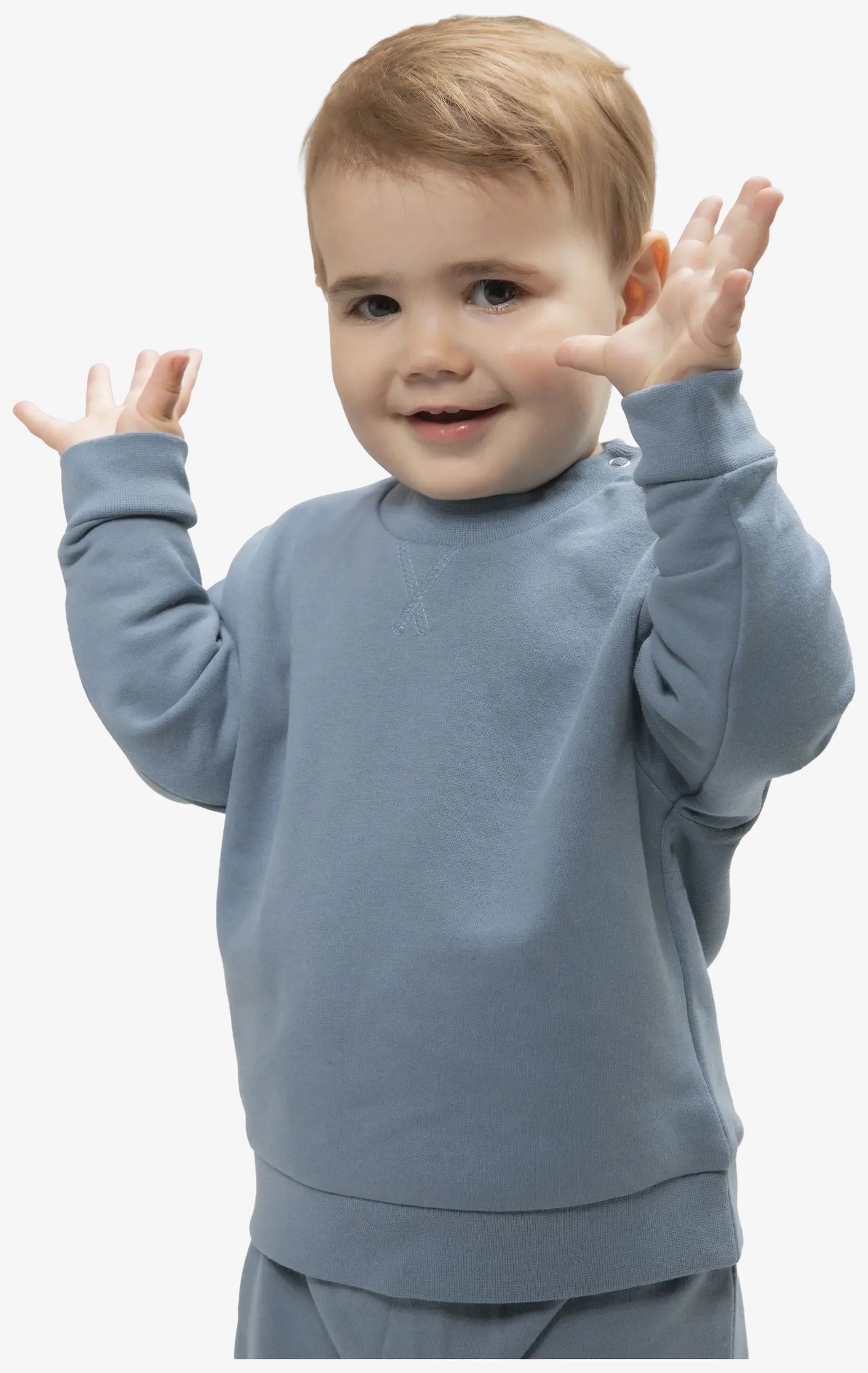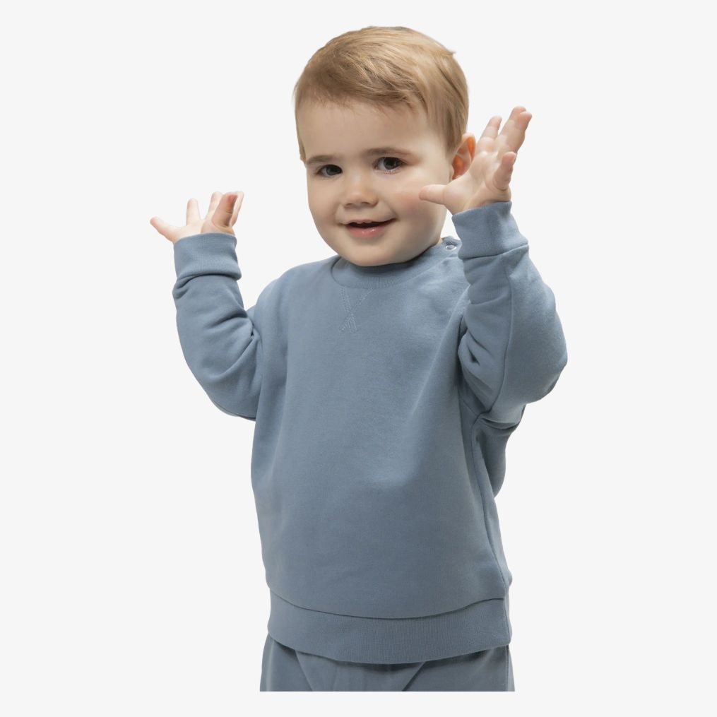Kids Sustainable Sweatshirt er en sweat til baby med manchetter og krave i rib, krydssømme foran og trykknapper på skulderen for lettere påklædning. Materialet kombinerer regenereret bomuld og genanvendt polyester.