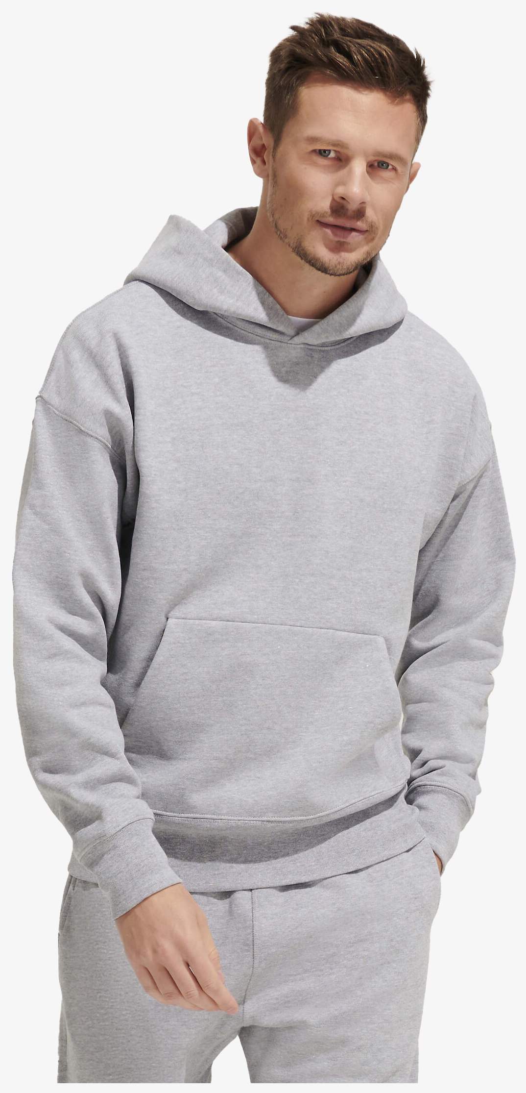 Unisex hættetrøje med oversize pasform, raglanærmer og sænkede skuldre. Indeholder kengurulomme, rib strikkede sidesømme, foret hætte og nakkebånd på indersiden af kraven.