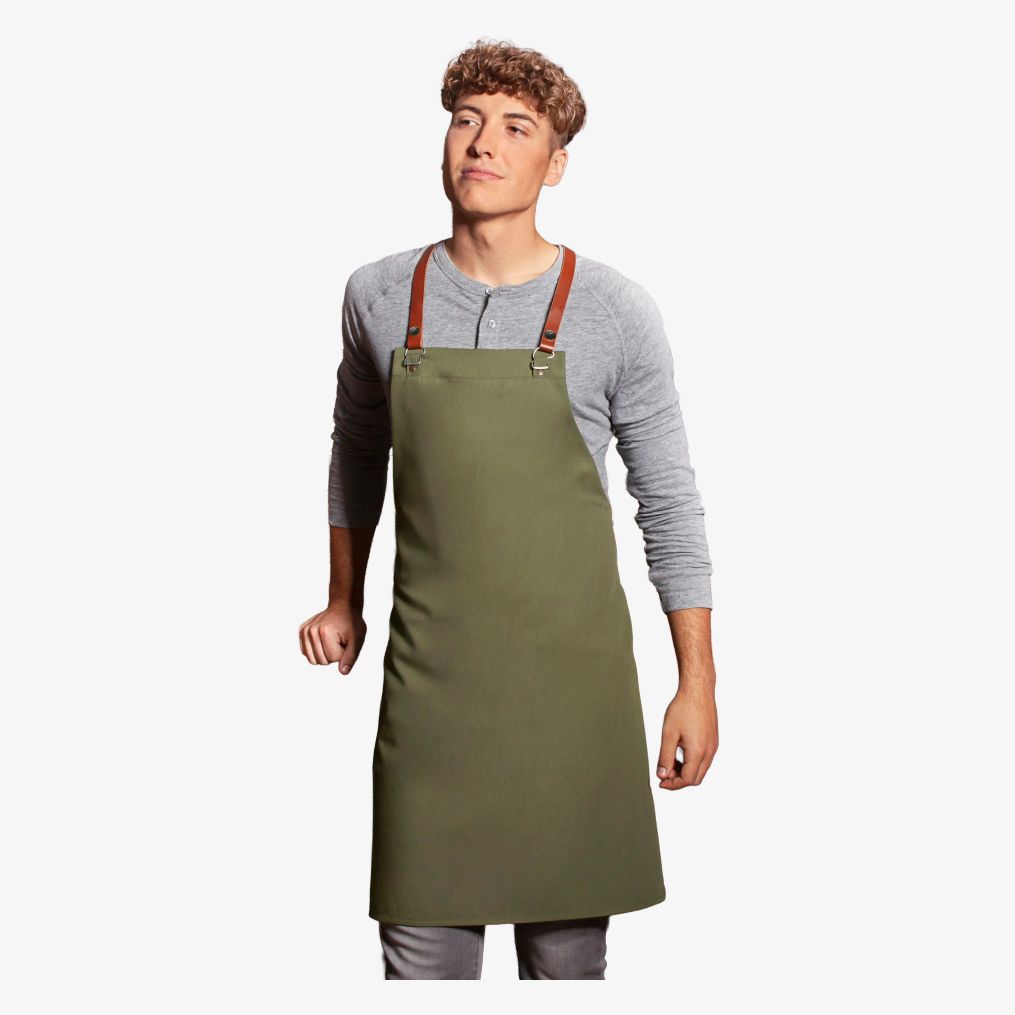 Forklædet i genanvendt polyester har krydsede stropper i læder og kontraststroppper på bagsiden. Stropperne er aftagelige med trykknapper for justerbar pasform.