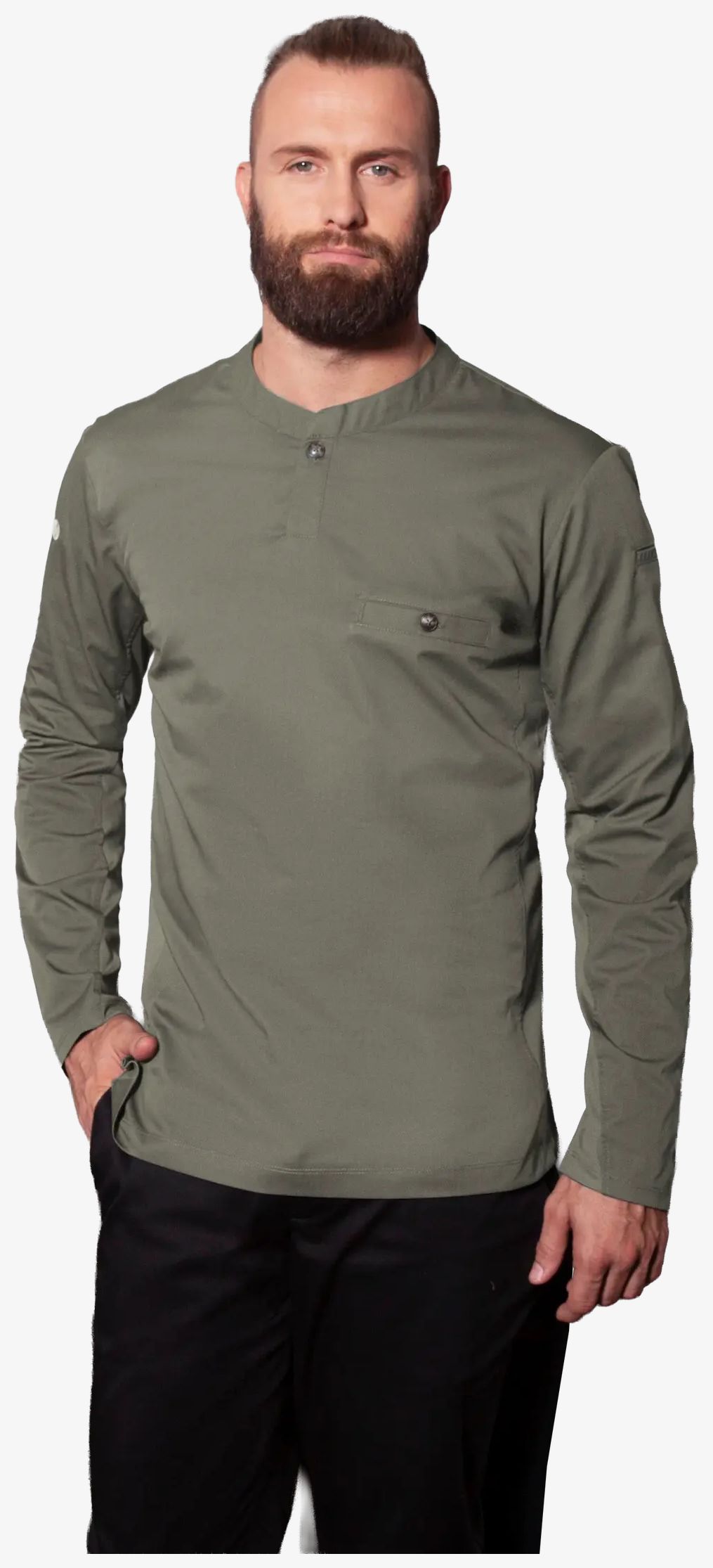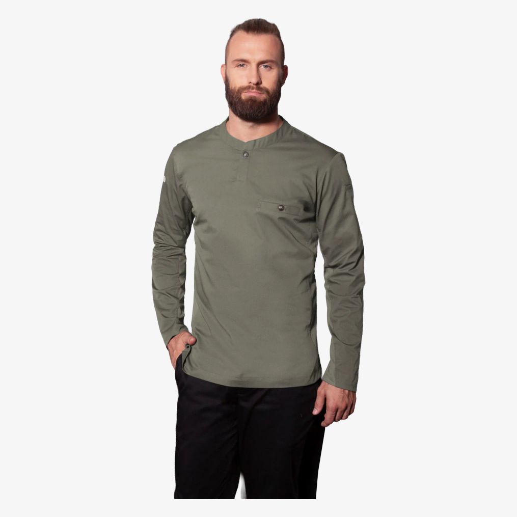 Langærmet tee-shirt Long-sleeve work shirt har en tætsiddende pasform og en officersekrave med knaphul. Den er åndbar, velegnet til køkken-, service-, rengørings-, pleje- og velværesektorer. En kantet lomme er placeret på brystet på venstre ærme.