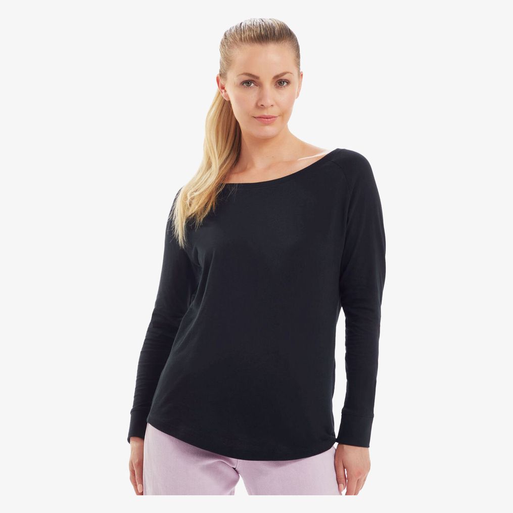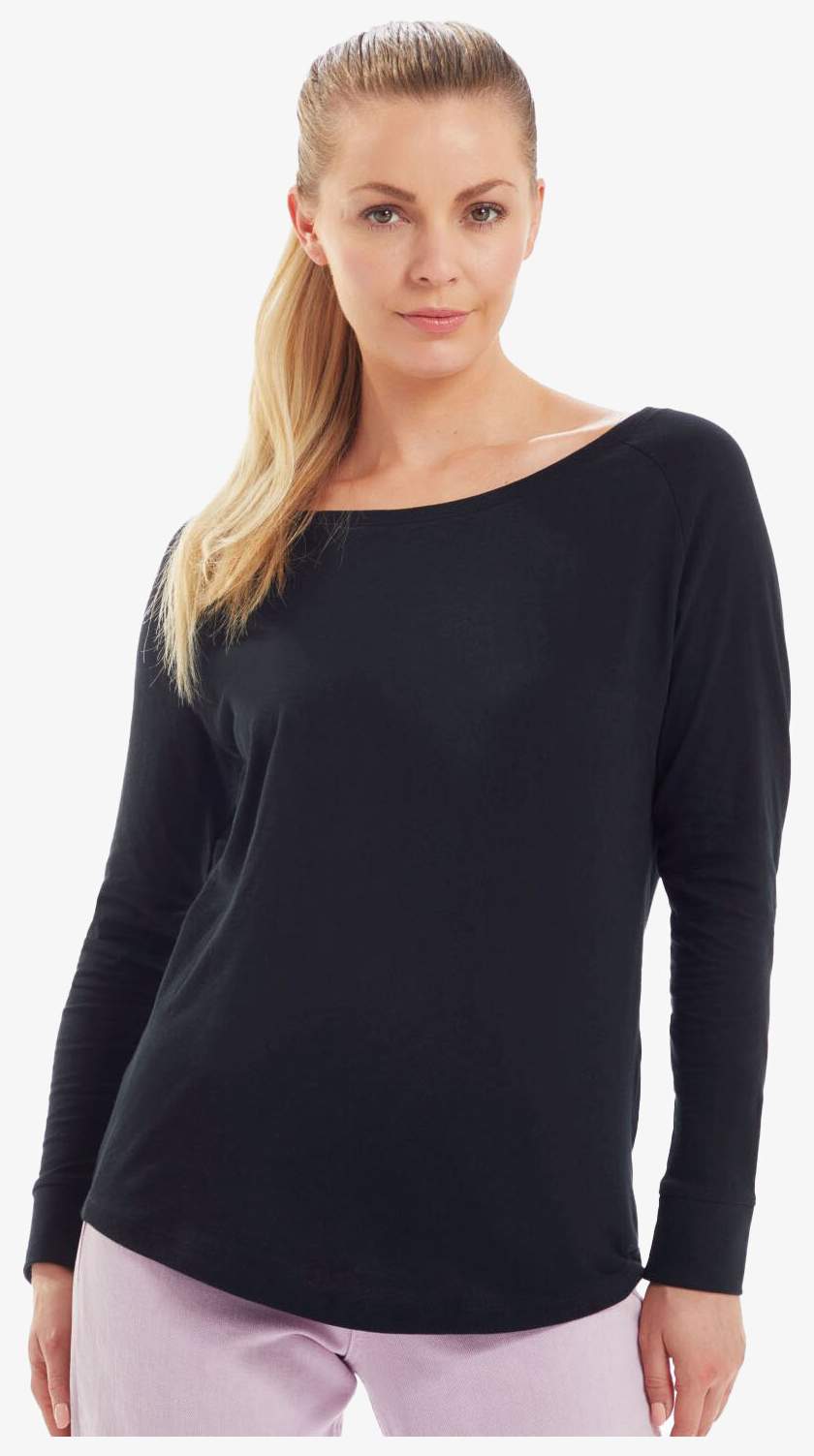 Langærmet tee-shirt til kvinder er lavet af økologisk bomuld eller konverteret ringspun kammad bomuld. Den har enkelt jersey, en bred udskæring og en moderne pasform. Raglanærmerne har en 1x0 ribkant. Den afrundede kant er let længere bagpå. Størrelsesmærket kan rives af.