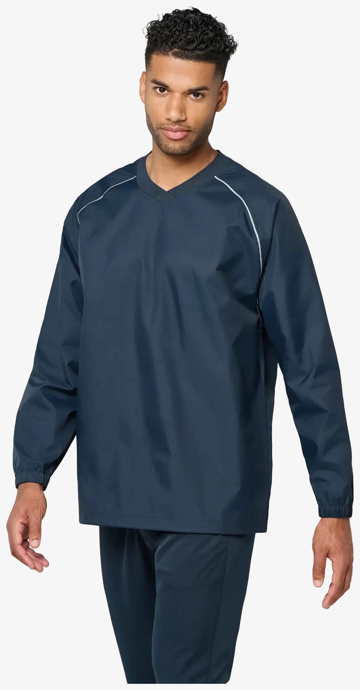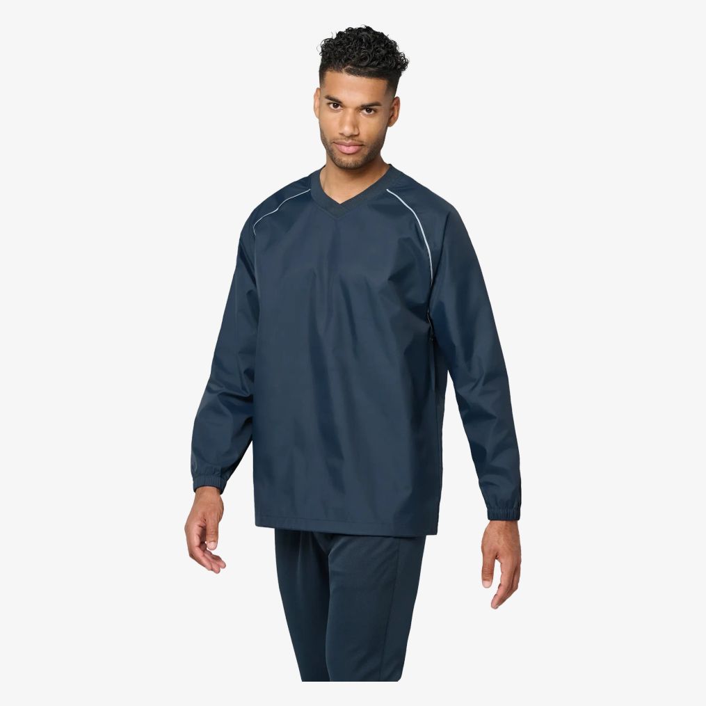Sweat Pluie Unisexe egnet til brug i regn med PU-belægning, vandtæt stof 1500 mm og varmepressede sømme ved ærmegabene. Raglanærmer, V-hals med 1x1 ribkant, ventilationsøjer og snøre med stopper.
