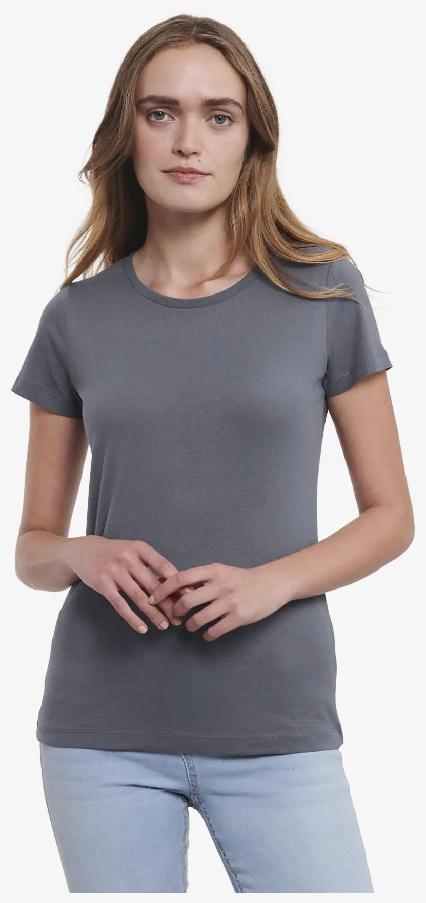 Pure Organic T femme er en tee-shirt i økologisk ringspun bomuld med glat overflade og moderne pasform. Den omfatter et elastansk bånd og et skulder-til-skulder renheds bånd. Designet uden etiket øger komforten. Lys oxford farve i 97% bomuld og 3% viskose.