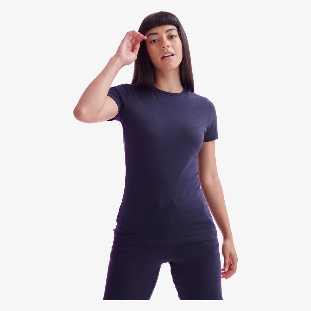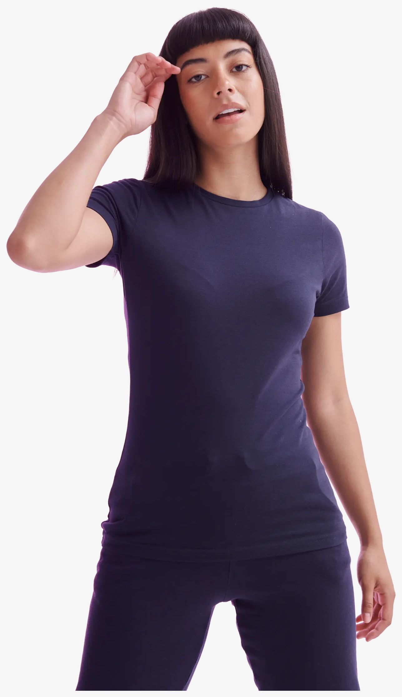 Dame stretch tee-shirt har rund hals og moderne lang pasform. Ribbet halskant er forbundet med en kantbånd.