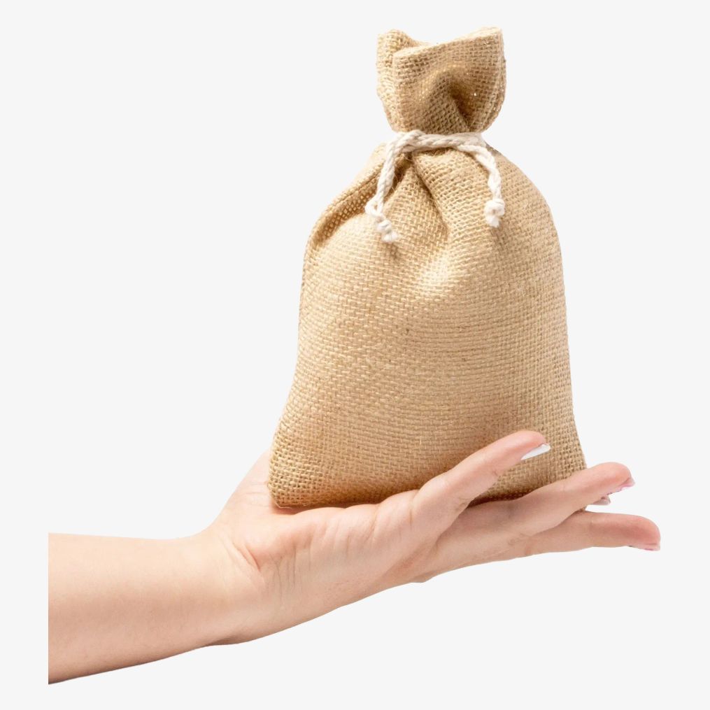 Posen Parma i jute lukkes med bomuldssnører. Formatet 22 x 14 cm egner sig til opbevaring af små genstande og tilbehør.
