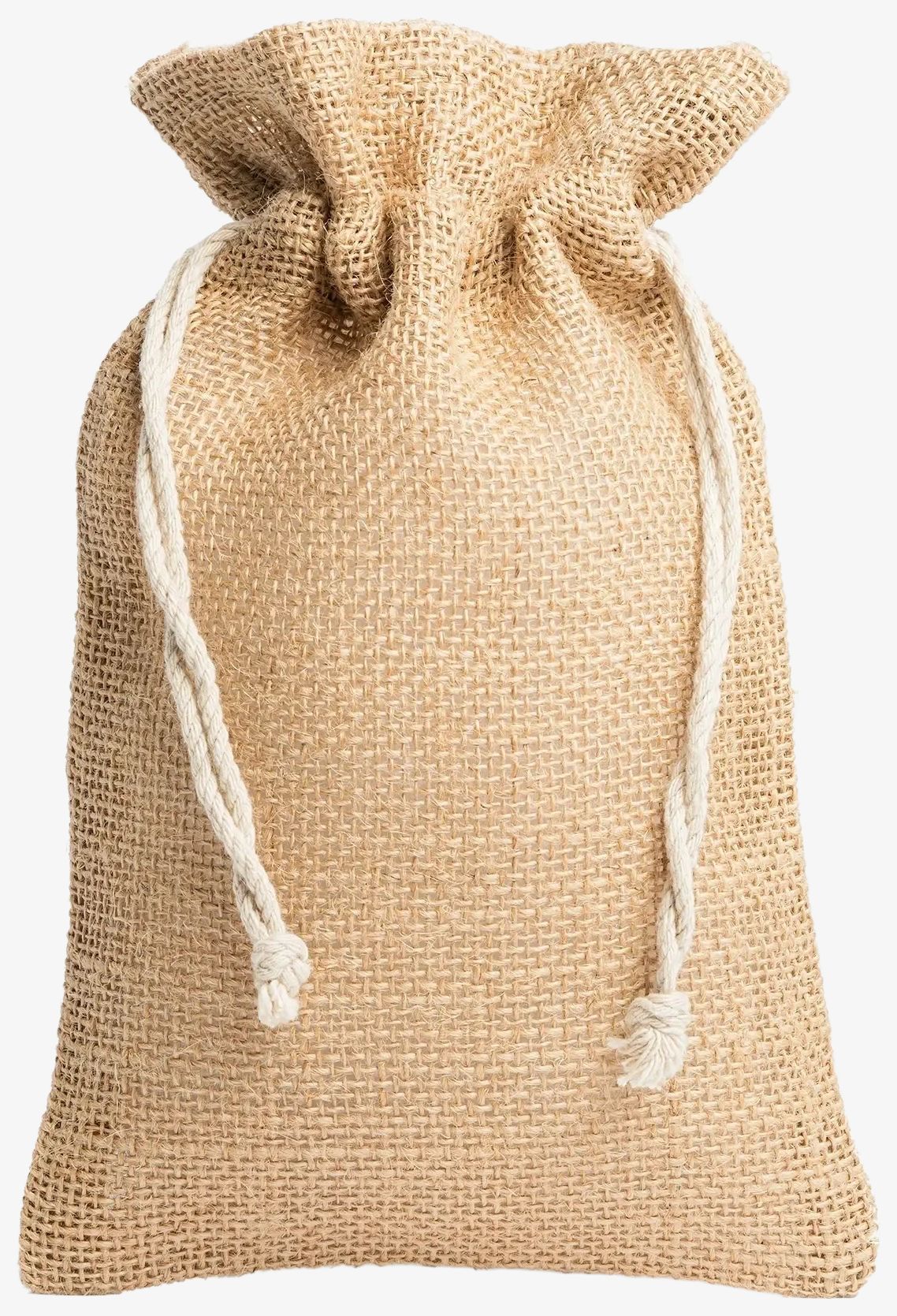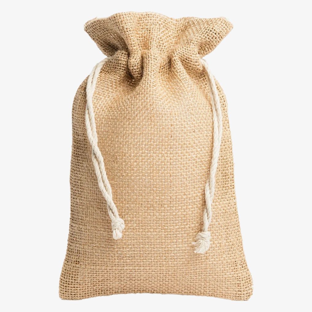 En naturlig jute pouch har en lukning med lukkesnøre i bomuld og måler 32 x 25 cm.
