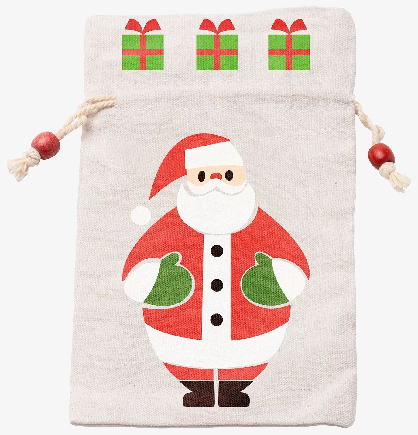 Bomuldsgavepose med julemandens motiv er designet til at indeholde små genstande. Den er genanvendelig, hvilket begrænser engangsbrug og giver et mere bæredygtigt alternativ. Dens dimension på 13 x 23 cm rummer forskellige genstande til højtiden.