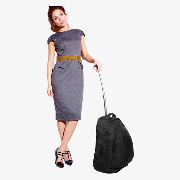 SAC A DOS AVEC ROULETTES bg25 er egnet til transport med et udtrækkeligt trækhåndtag, integrerede hjul, lynlåslommer og indvendige fastholdelsesstropper. Format 35 x 52 x 24 cm.