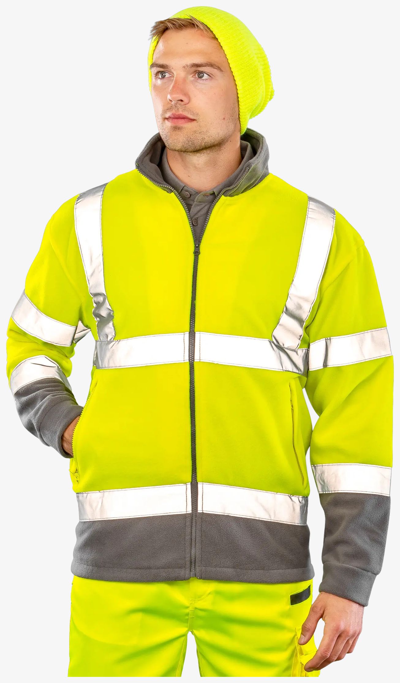 Safety Microfleece sikkerhedsjakke r329x i mikrofleece med refleksbånd på ærmer, skuldre og krop. Sidelommer med lynlås, høj krave, løs pasform, uden for.
