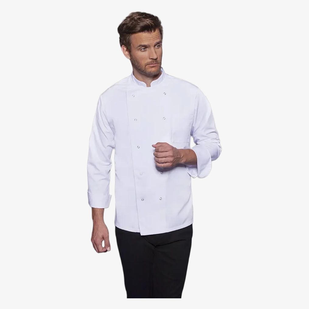 Den unisex kokkejakke har et klassisk snit med manchetter med slidser og en brystlomme på venstre side. Den har en krydset lukning med 10 knapper og 10 trykknapper.