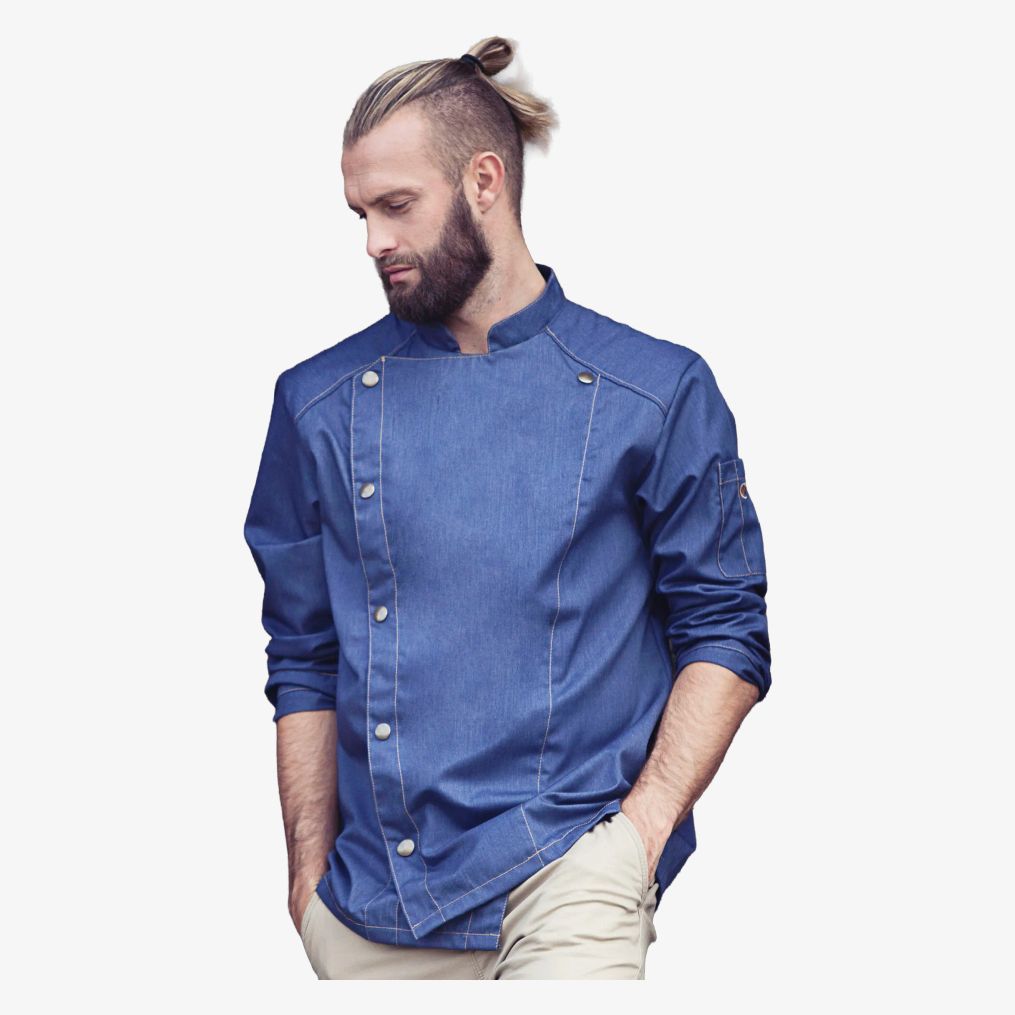Kokkejakke i jeansstil kendetegnet ved en asymmetrisk lukning med 5 trykknapper og kontrastsømme. Den har manchetter med slids og en pennelomme på venstre ærme.