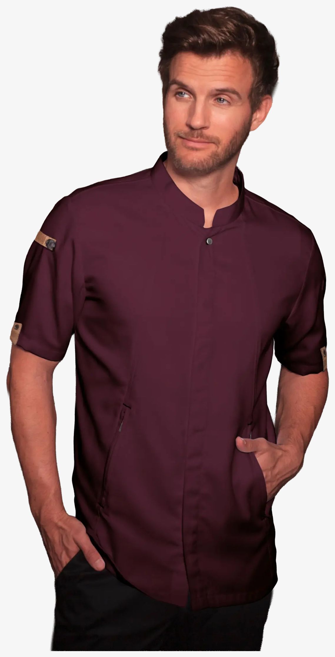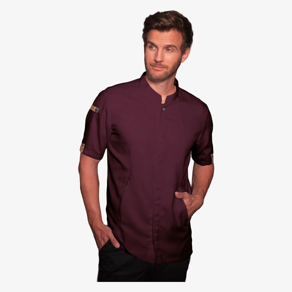 Kortærmet kokkefrakke jm36 er lavet af bæredygtigt tekstil, der kombinerer certificeret genanvendt polyester og bomuld. Den har en let slank pasform og lukkes med trykknapper. Den forreste del indeholder lynlåslommer samt en kantet lomme på venstre ærme.