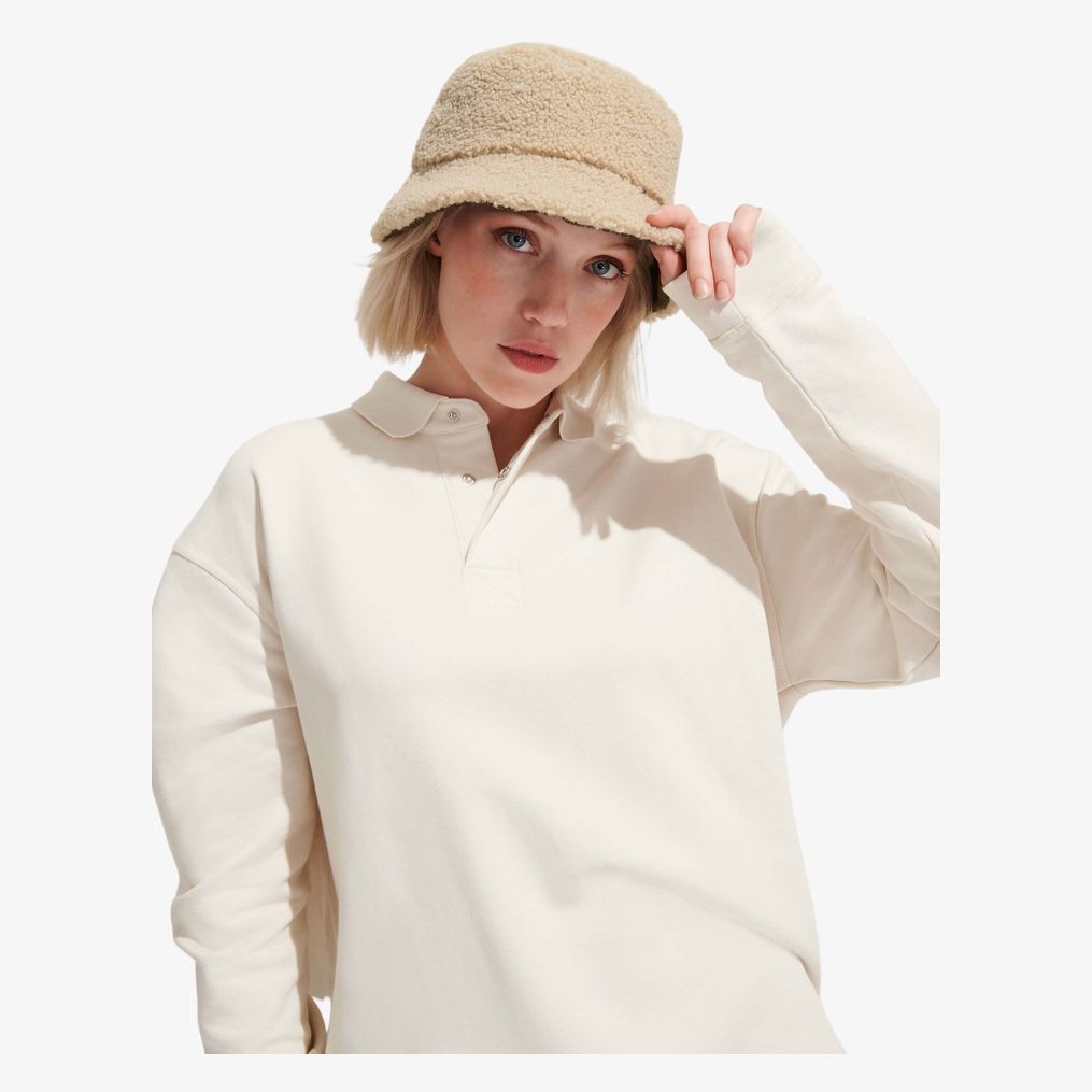 Der wendbare Bob aus zwei Materialien kombiniert eine Außenseite aus Cord und eine Innenseite aus natürlich beigem Sherpa. Dieses Modell verbindet zwei Texturen für eine vielseitige Nutzung.
