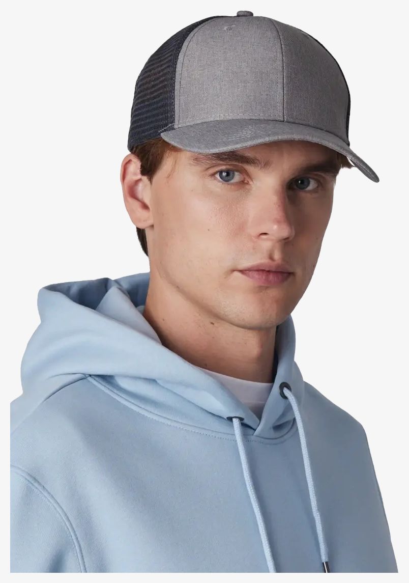Die 6-teilige Trucker-Kappe hat Vorderteile aus Oxford-Polyester und recyceltes Polyester-Mesh. Sie verfügt über einen Snapback-Verschluss, der für die meisten Größen geeignet ist. Das Gewebe ist strapazierfähig und pflegeleicht.