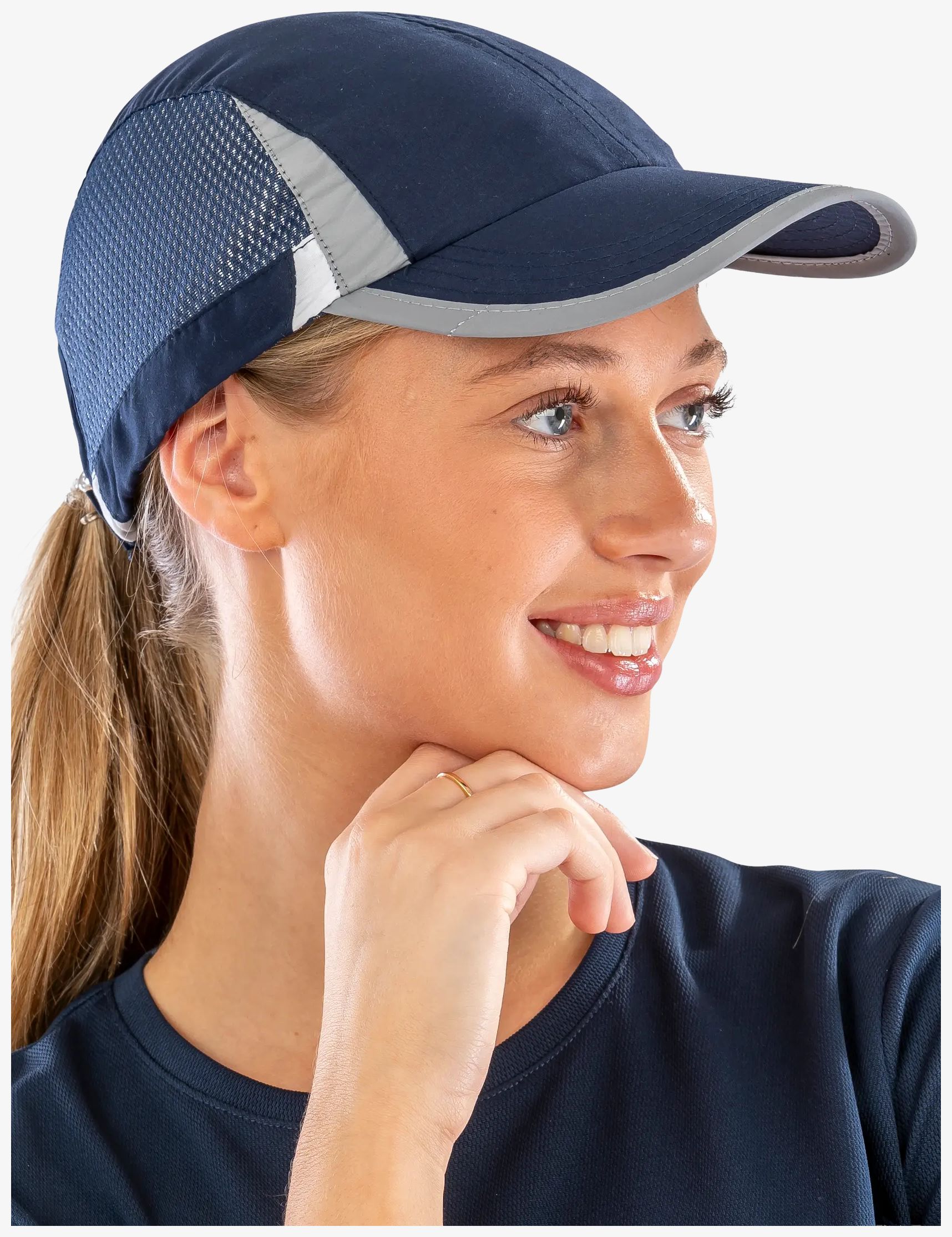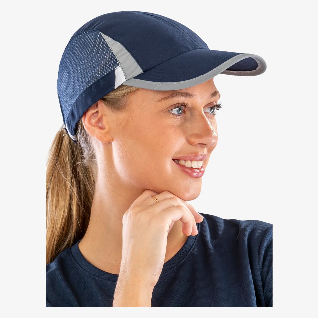 Die [[Spiro Sport cap]] ist eine 6-Panel-Kappe mit seitlichen Mesh-Einsätzen, niedrigem Jockey-Profil und vorgeformtem Schirm. Größe per Klettverschluss verstellbar. Reflektierendes Finish am Schirm und an der Krone. Schirm aus recyceltem PU.