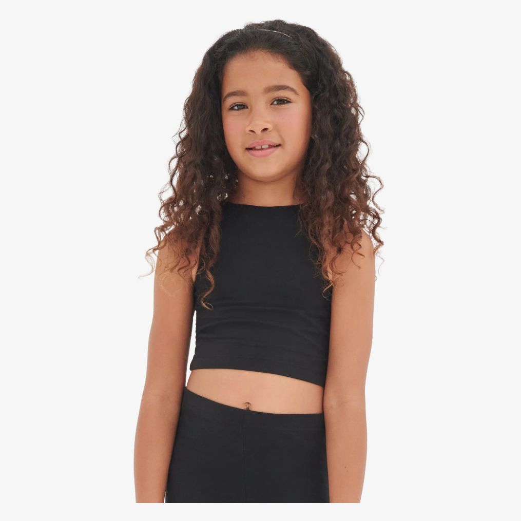 Das Kinder-Crop-Top-Trägershirt mit Rundhalsausschnitt besteht aus 93% Baumwolle und 7% Elasthan. Es hat doppelte Nähte am Kragen, an den Armausschnitten und am Bund sowie ein abnehmbares Etikett.