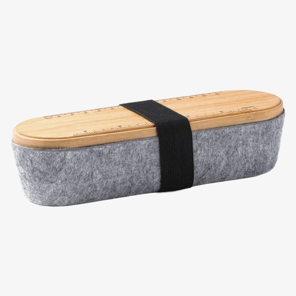 Der Stifthalter NIBIX verbindet einen Deckel aus Bambus mit einer Hauptstruktur aus recyceltem Filz. Er enthält ein integriertes Lineal im Deckel und eine Smartphone-Halterung für vielseitige Nutzung.