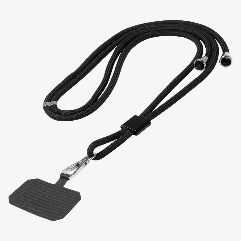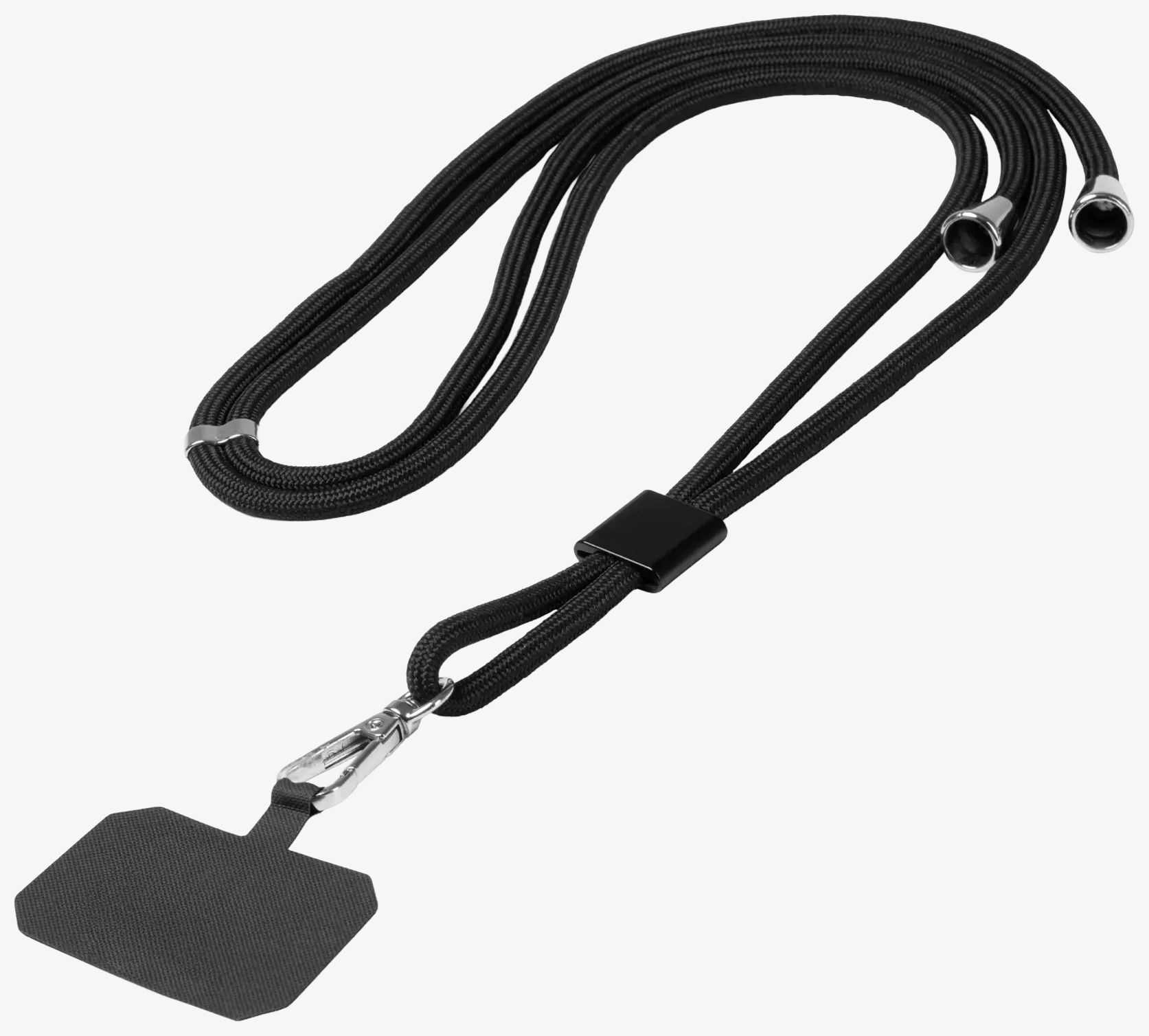 Das Handyband ist aus recyceltem Polyester RPET gefertigt. Es verfügt über einen verstellbaren Riemen und einen Karabiner für flexible Befestigung.