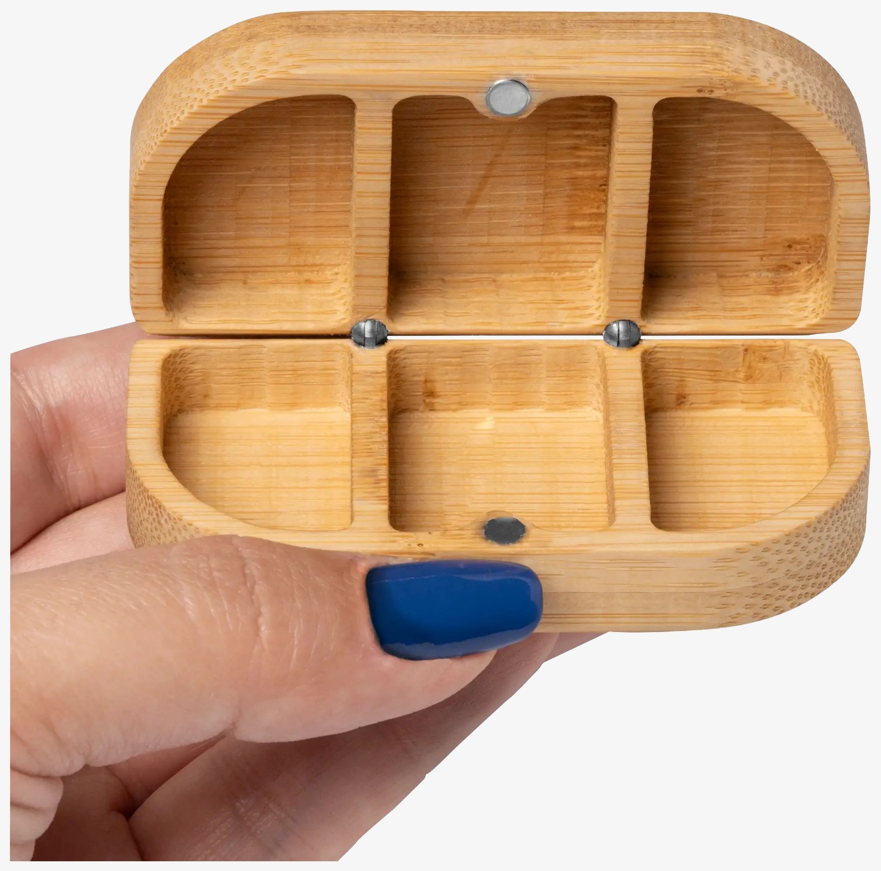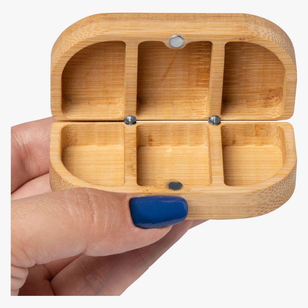 Die Pillenbox Mildor sb1477 aus Bambus verfügt über drei getrennte Fächer zur Organisation der täglichen Einnahmen. Der Magnetverschluss erleichtert das Öffnen und Schließen. Das kompakte Format ermöglicht eine einfache Aufbewahrung in einer Tasche oder Schublade.