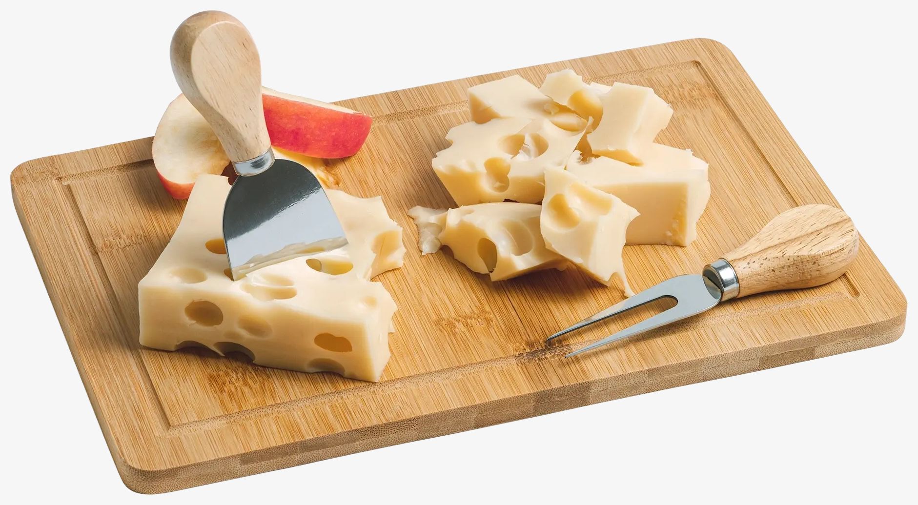 Das rechteckige Schneidebrett aus Bambus verfügt über ein Profil zur Flüssigkeitsaufnahme. Es bietet eine stabile und natürliche Oberfläche, geeignet für verschiedene Kochvorbereitungen.