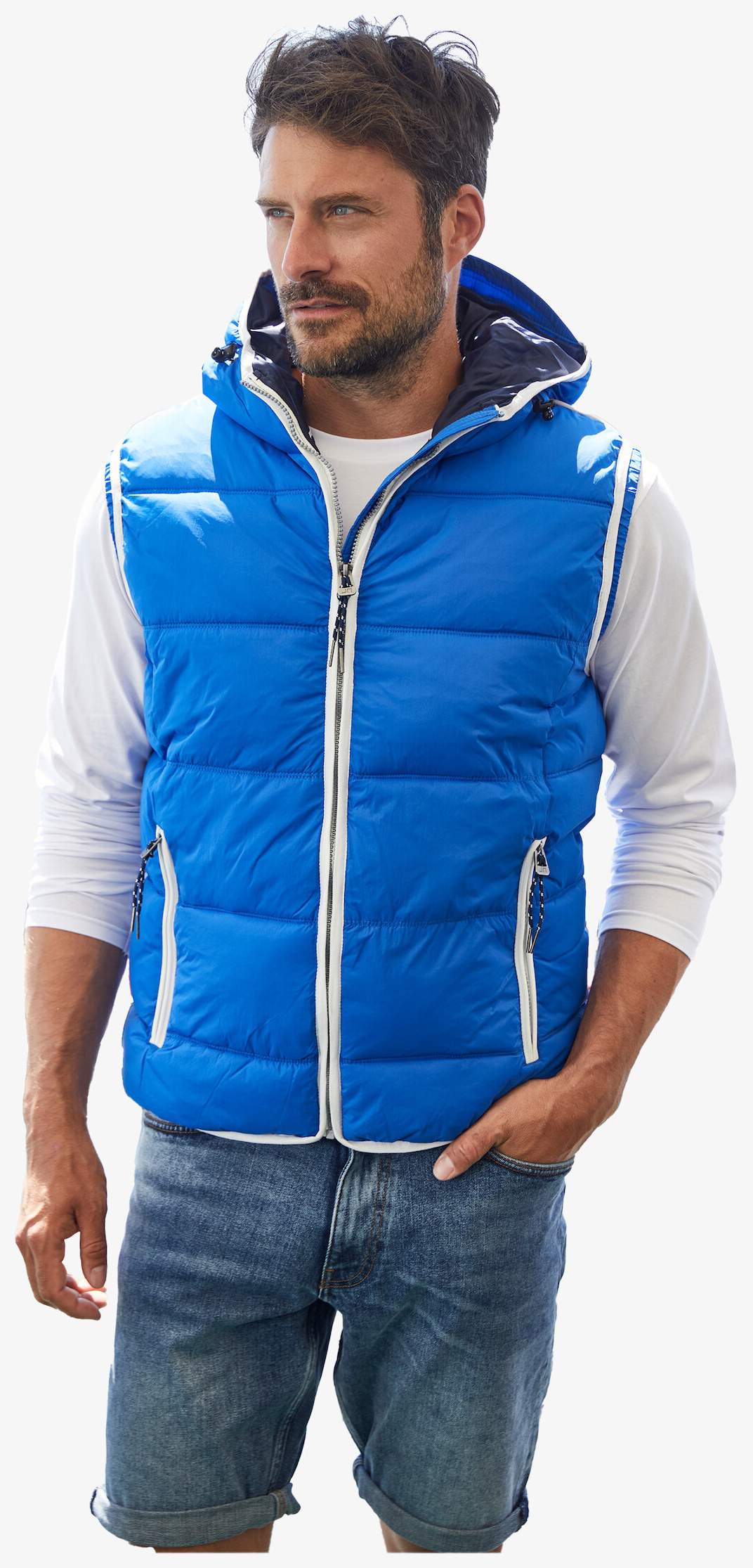 Die Men's Maritime Vest ist eine leichte gesteppte Daunenweste mit Kapuze, matter Oberfläche und TPU-Beschichtung. Das Kleidungsstück ist winddicht und wasserabweisend mit einem Wassersäulenwert von 600 mm. Es verfügt über zwei Seitentaschen, eine Innentasche und eine winddichte Blende. Kontrastierende Besätze und ein elastischer Kordelstopper statten die Kapuze aus. Die Armlöcher sind elastisch für eine anliegende Passform, mit einem dekorativen Reißverschluss am Rücken.
