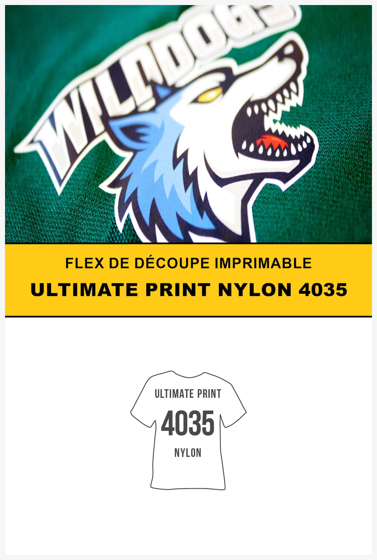 Das druckbare Flex Vinyl Ultimate Print Nylon 4035 ist für die Anwendung auf Nylon mit einer Polyamid-Heißkleber entwickelt. Es beinhaltet eine nicht haftende PET-Folie mit 0,10 mm Dicke und einer Toleranz von 5 %. Der Transfer erfolgt bei 150 °C unter 2,0 bar Druck mit einer Vorpressung von 4 Sekunden, gefolgt von einem zweiten Pressvorgang von 10 Sekunden nach Entfernung der warmen PET-Folie.