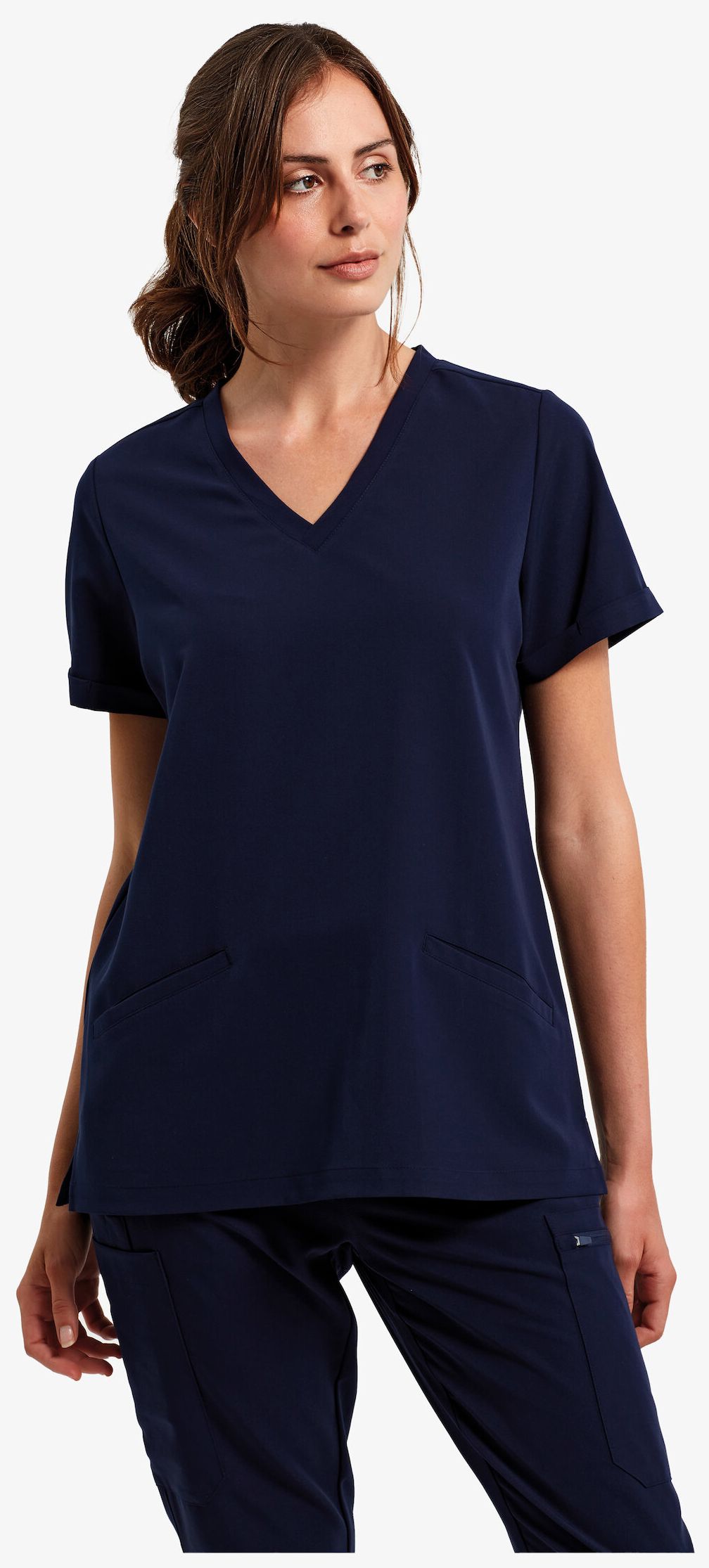 Die unverwüstliche Onna-Tunika ist für den weiblichen medizinischen Gebrauch mit kurzen Ärmeln und vierfach elastischem Stoff konzipiert, der Atmungsaktivität und Pflegeleichtigkeit bietet. Sie verfügt über einen V-Ausschnitt, umgeschlagene Ärmel, zwei Vordertaschen, Abnäher am Rücken und Seitenschlitze für eine moderne Passform.